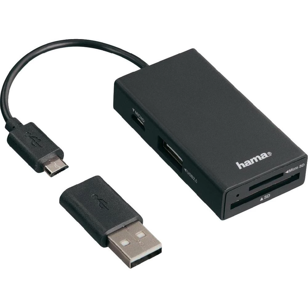 1-portni USB 2.0 hub Hama s OTG funkcijom, s ugrađenim čitačem SD kartica crni