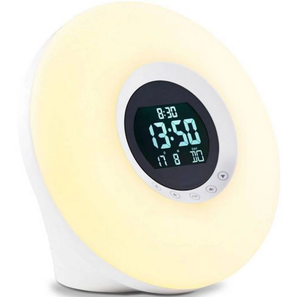 Probudite se poljubljeni suncem svaki dan: Svjetlo za buđenje iz ADE-a dočarava taj blagdanski osjećaj u svakodnevnom jutarnjem životu. Digitalna svjetlosna budilica simulira izlazak sunca i priprema nježni završetak faze dubokog sna prije nego što se probudite. Intenzitet svjetlosti postupno se povećava tijekom 30 minuta. Tek nakon svjetlosne faze oglasi se alarm - dostupan je klasični alarm ili 6 prirodnih zvukova. Ako se više volite buditi uz glazbu, možete aktivirati integrirani radio i prepustiti se da vas probudi vaša omiljena stanica - uključena je kontrola glasnoće i funkcija odgode. Sunčano svjetlo za buđenje može još više ponuditi: Kao svjetlo raspoloženja svijetli u sedam različitih boja, s više ili manje intenziteta prema potrebi. Kao neutralno svjetlo za čitanje, zamjenjuje noćnu svjetiljku. Da biste lakše zaspali, odbrojavanje vremena za radio ili rasvjetu može se postaviti na 15, 30, 45 ili 60 minuta. LED zaslon opremljen je s četiri razine osvjetljenja i gumbom za osvjetljenje. Zaslon (51 x 36 mm) prikazuje vrijeme, vrijeme alarma, datum i dan u tjednu. Digitalnom svjetlosnom budilicom upravlja se pomoću senzorskog dodira i tipki. Tijelo budilice izrađeno je od visokokvalitetne ABS plastike i dimenzija je 170 x 160 x 124 mm (Š x V x D). Isporuka uključuje USB kabel s napajanjem i 3 baterije 1,5 V AA. ... prikaži manje