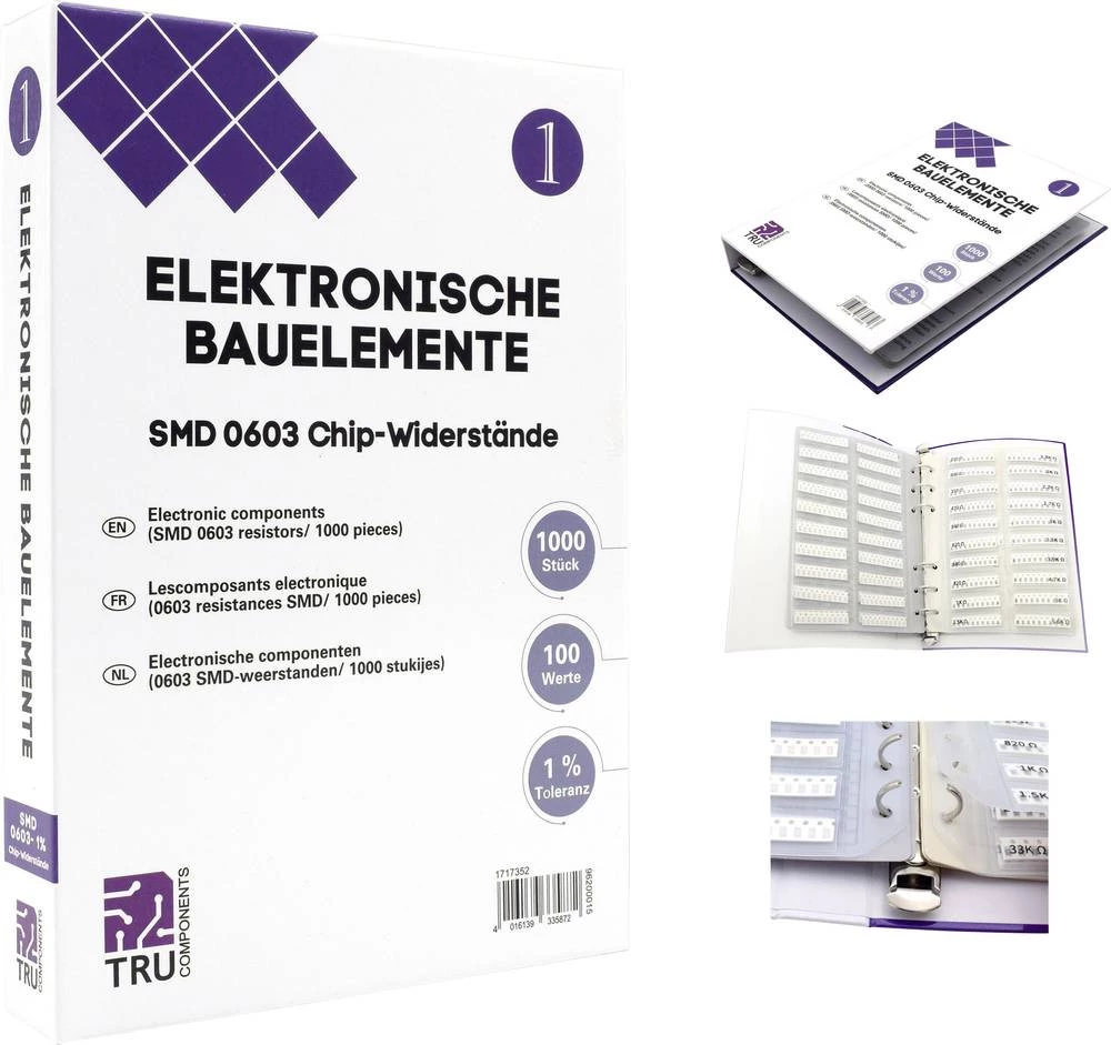 Ovaj SMD Chip Resistance Folderbook je posebno dizajniran za pokrivanje svih uobičajenih vrijednosti 0603 SMD otpornika. Sadržaj pokriva vrijednosti od 0,10 Ω do 10 MΩ u rasponu tolerancije od ± 1%. Maksimalna disipacija snage ovog dizajna je 1/10 W. Ako se komponente potroše, knjiga se može ponovno napuniti ili ponovno upotrijebiti za druge SMD komponente. Opsežni i detaljni tehnički opis sadržanih komponenti jasno je prikazan na prvim stranicama ovog rada. Tablica sadrži dodatne korisne informacije o sadržaju, ali i važne tehničke pojedinosti o sadržanim vrijednostima otpora.