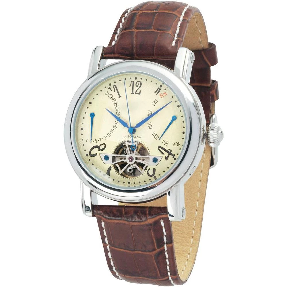 Automatski sat elegantnog, nostalgičnog izgleda s remenom izgleda krokodilske kože oduševljava svojim višenamjenskim prikazom. Pored vremena prikazuje dan u sedmici i datum. Stakleno dno omogućava