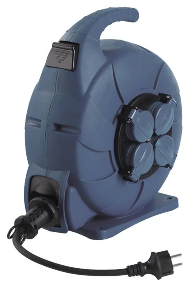 Kobilica za kabel pokretne opruge s automatskim povlačenjem; Boja: plava s 4x utičnom utičnicom s poklopcima sa šarkama; Struja: 15m H07RN-F 3G1,5 sa kontaktom za uzemljenje; 230V / 16A / maks. 3500W otkopčan i 1000W namotan; VDE baterije toplinska krug; s plastičnom ručkom.
