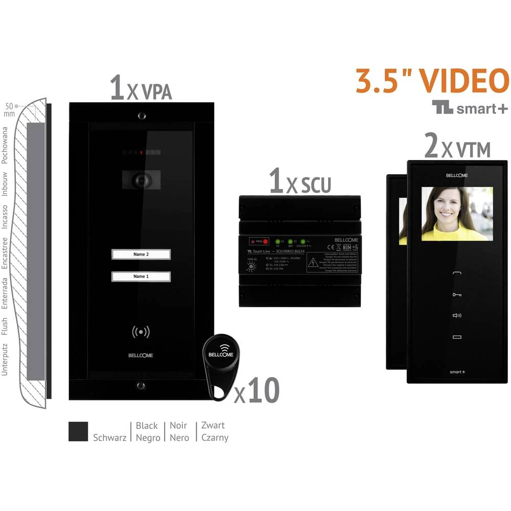 BELLCOME Smart+- Interfon za video vrata Kompletni KIT za 2 obitelji, CRNI, instalacija sa 4 žice, kaljeno staklo i dodirni gumbi u zatvorenom i na otvorenom, integrirana neisključiva video kamera i IR rasvjeta, osvijetljeno ime, 3,5 "(8,89 cm ) TFT LCD zaslon, full duplex (bez ručnog uređaja), vanjska jedinica ugradbena utora.