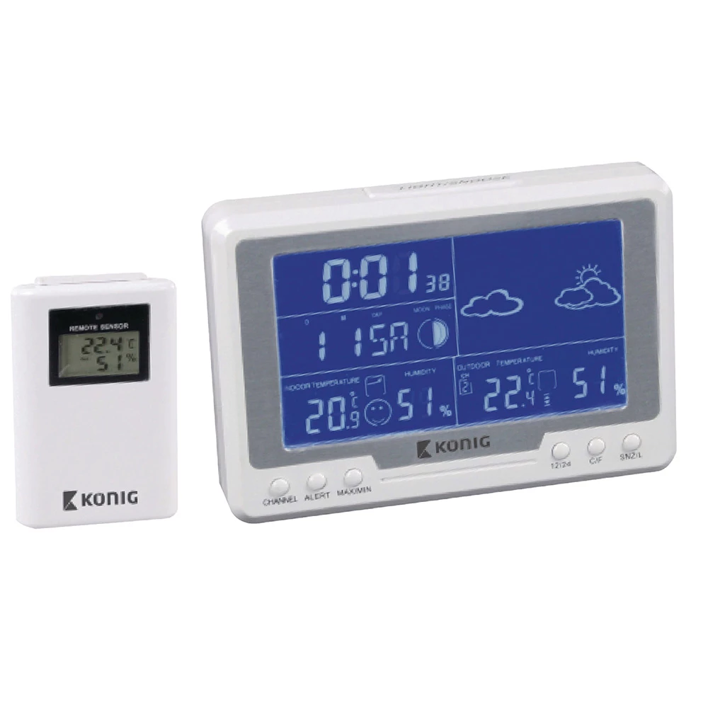 Pogledajte u trenu kakvo je vrijeme vani ili kakva je temperatura i vlaga unutra. Osim spomenutog, ova meteorološka stanica je opremljena sa radio kontroliranim satom tako da uvijek imate točno vrijeme. Kalendar traje do 2099 i stanica sprema trend promjene tlaka zraka i temperature. Funkcija alarma čini ovu stanicu vrlo pogodnom za postavljanje na ormarić. Uključuje bežičnu vanjsku jedinicu.