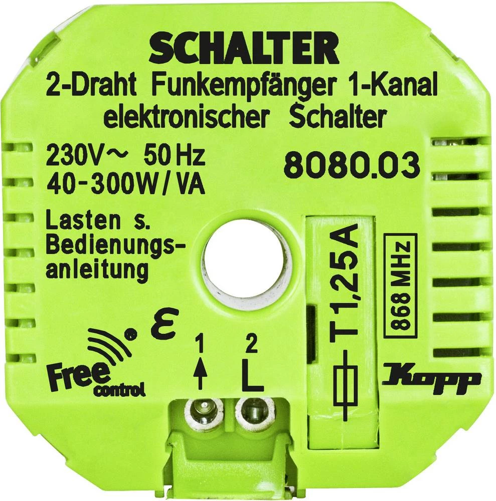 Ovi radio prijemnici mogu se ugraditi u konvencionalne kutije za ugradnju i upravljati preko Kopp Free-Control radio zidnih odašiljača ili bežičnih ručnih odašiljača. Sustav prenosi podatke na pouzdanu frekvenciju od 868 MHz, što uzrokuje manje interferencije nego što je to slučaj u mnogim 433 MHz sustavima.