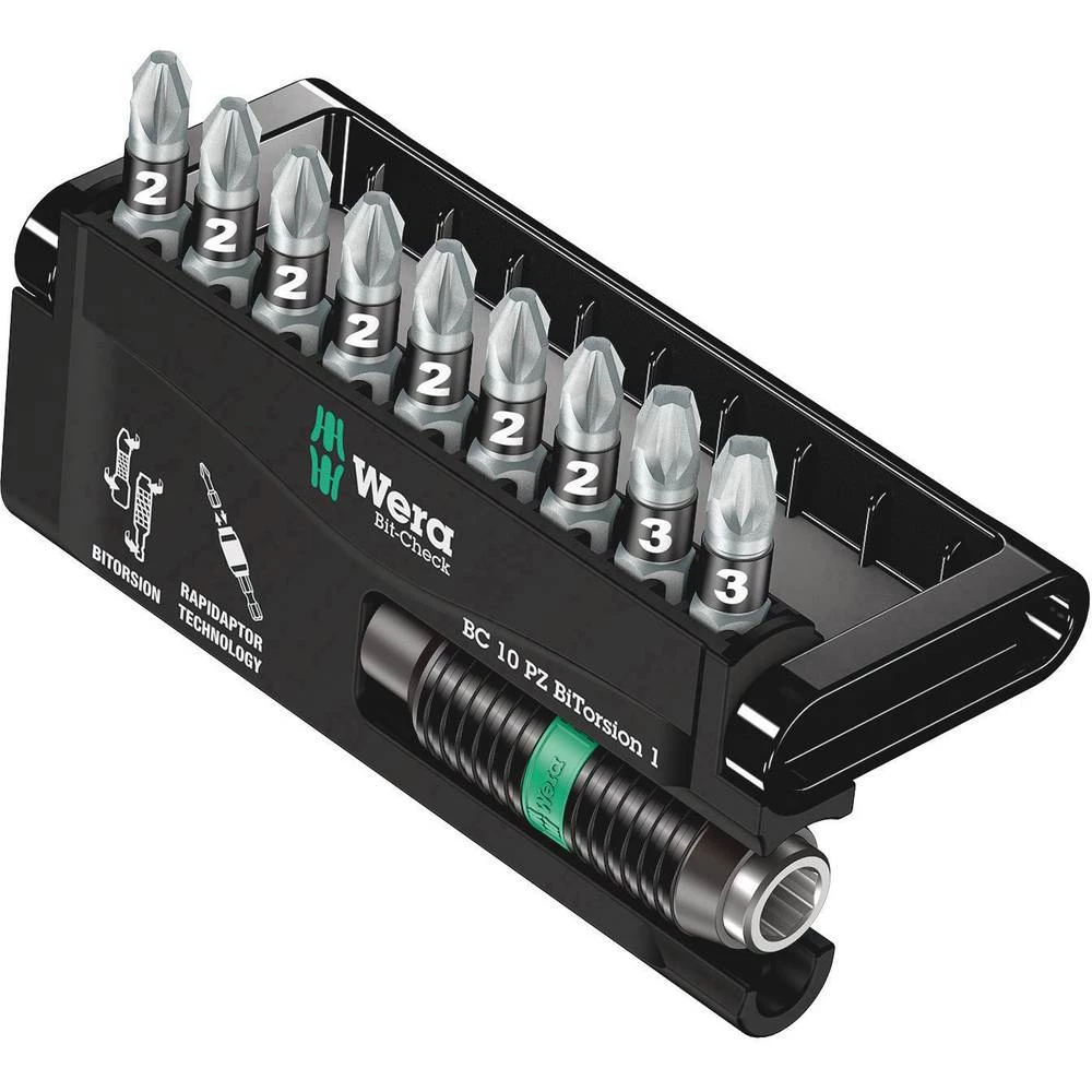 Robusna provjera bitova od strane Wera. Provjera bita omogućuje brzi pregled postojećeg alata. Nepotrebni bitovi se jednostavno vraćaju u asortiman i ne gube. Jednostavan transport, npr. U džepu košulje. Čvrsti čvrsti bitovi, za univerzalnu uporabu. BiTorcijalni bitovi s elastičnom torzijskom zonom u koju se kinetička energija rasipa pri vršnim opterećenjima. S mekšom bi-torzijskom zonom koja sprječava uvijanje vrha bita pod velikim opterećenjem. To značajno povećava životni vijek proizvoda. Najbolji život s odgovarajućim držačem. Opremljena je Rapidaptor tehnologijom koja omogućuje da se bitovi podižu čak i bez aktiviranja rukava. Uklanjanje bita se vrši jednostavnim pomicanjem prema naprijed - za munjevito brze promjene bitova, čak i samo jednom rukom. Za prihvat bitova sa šesterokutnim pogonom 1/4 "prema DIN ISO 1173-C 6.3 i E 6.3. Za uključivanje u nuturnicu ili za uporabu u steznoj glavi elektroničke bušilice.