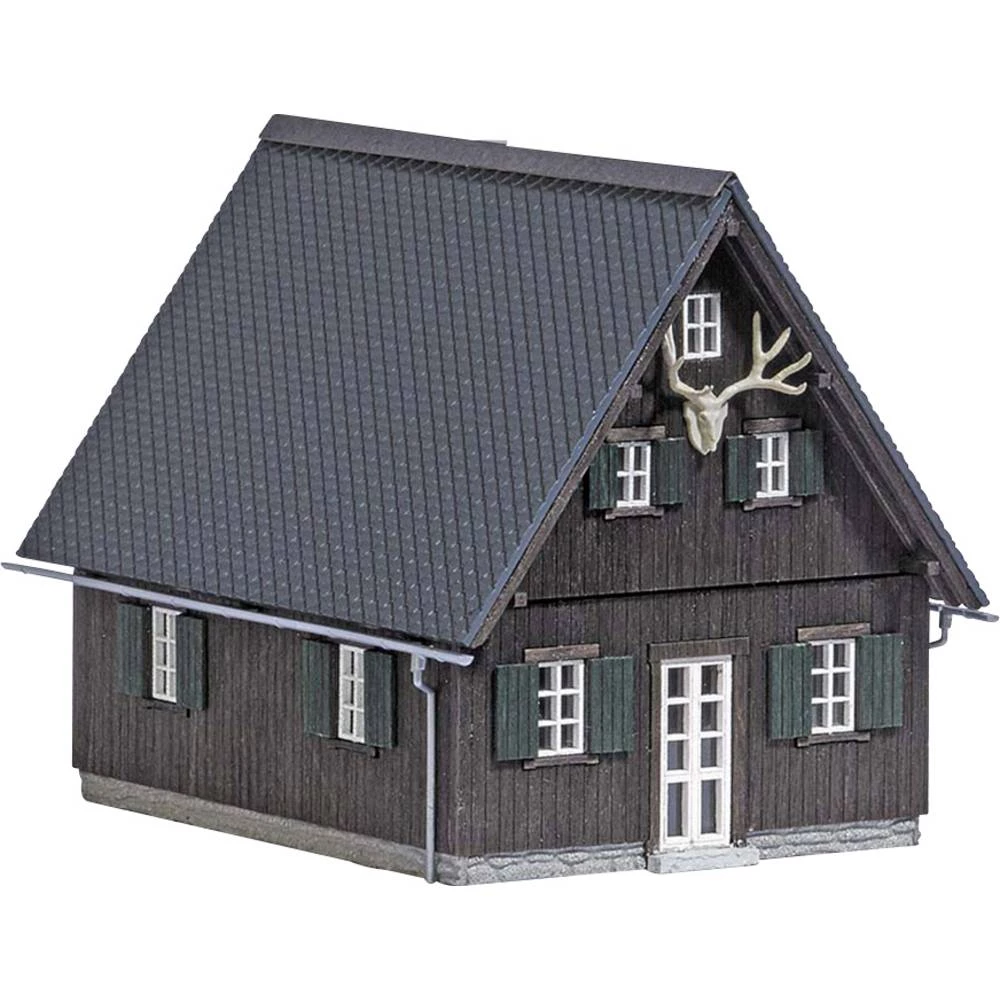 Komplet za rustikalnu šumsku kuću, također napravljen od pravog drveta kao model. S jelenskim rogovima na prednjem zabatu. Filigranski kišni oluci i odvodne cijevi od plastike. Svi dijelovi završeni u boji.