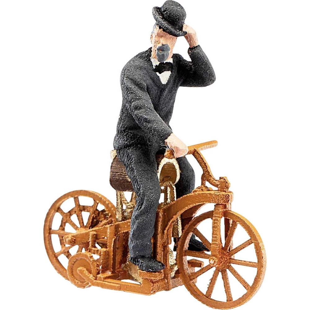 Je li ljubazni gospodin u prljavom kaputu sa šeširom vjerojatno sam izumitelj ??? 29. kolovoza 1885. Daimler je prijavio patent (DRP 36423) za prvi svjetski motocikl koji je upravljao motorom s unutarnjim izgaranjem. Carl Benz, rođen u Karlsruheu 25. studenog 1844. godine, u Mannheimu je mogao uspostaviti vlastitu malu mehaničarsku radionicu iz 1872. godine, što je omogućilo njegov svekar. Nešto kasnije, Gottlieb Daimler osnovao je testnu radionicu u Cannstattu 1882. godine, gdje je zajedno sa svojim zaposlenikom Wilhelmom Maybachom razvio kompaktni, brzinski jednocilindrični četverotaktni motor. Tri izumitelja stavili su svoje ideje na ploču za crtanje. U radionicama su stvoreni prototipovi, koji su se stalno testirali i usavršavali. 16. prosinca (DRP 28022) i 22. prosinca 1883. (DRP 28243) kontrolirani plinski motor s paljenjem užarene cijevi zaštićen je u patentnom uredu. Ovaj motor veličine 462 cm3 proizveo je 1 KS (735 W) i zvao se "djedov sat". Revidirana verzija, koja je patentirana 3. travnja 1885. (DRP 34926), već je imala manji pomak, i to 264 cm3. Ovo smanjivanje i rad s benzinom omogućili su ovaj "lak" motor od 60 kg za lokalnu uporabu. Sada bi se motor mogao instalirati u vozilo. Odlučeno je kupiti jeftin dvokotač izrađen od drveta hikira (biljka oraha, koju karakterizira vrlo tvrdo, otporno i izdržljivo drvo) s ojačanjima od željezne ploče. Ispuh motora bio je instaliran ispod sjedala oblikovanog kao sjedalo za jahanje (ovo je sjedalo moglo dati ime "vozački automobil" prvom motociklu). Blok-kočnice na stražnjem kotaču mogu se aktivirati pomoću užadi na upravljaču. Divno dizajnirani model s vozačem apsolutni je naglasak u svakoj kolekciji ili na dobro njegovanim objektima i dioramama.