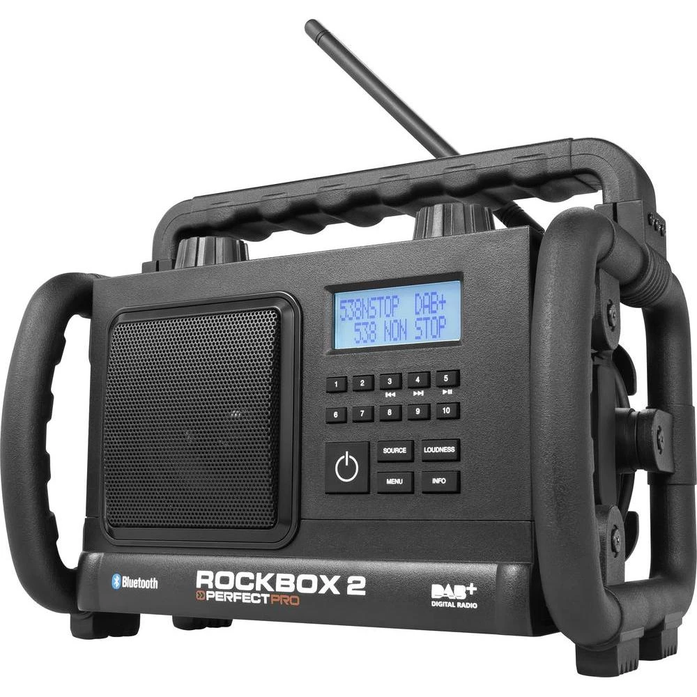 DAB+ radio PerfectPro Rockbox 2 Radio za gradilište audio, stereo (3.5 mm jack), Bluetooth®, funkcija punjenja baterije, zaštita od prskanja vodom, otporan na prašinu, otporan na udarce crna