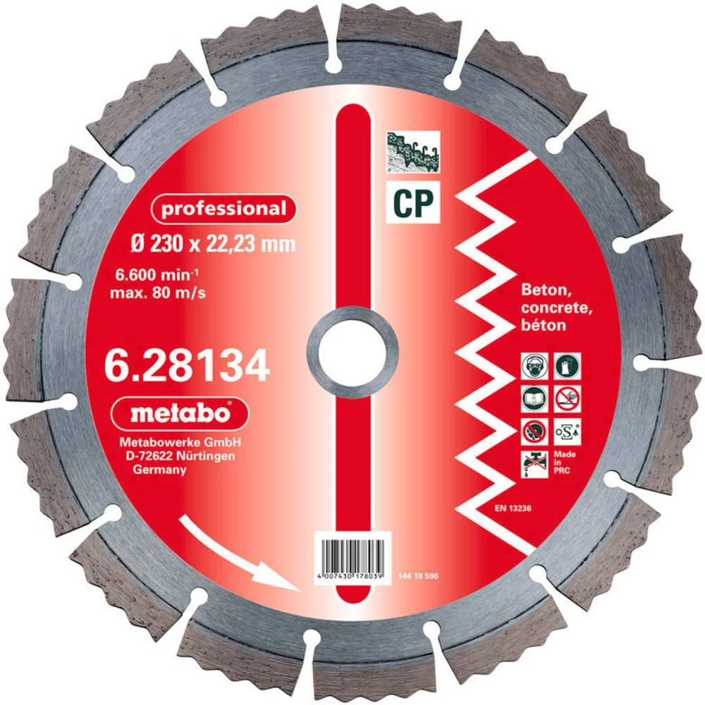 Diamant-Trennscheibe, 115 x 2,15 x 22,23 mm, ""professional"", ""CP"", Beton. Ideal für alle harten Baumaterialien, wie Beton (auch armiert), Betonrohre, Granit, harte Sandsteine, Verbundsteine, Waschbeton. Auf hohe Anforderungen abgestimmte Qualität von Diamant und weicher Bindung für optimale Schnittleistung und hohe Standzeit. Lasergeschweißte Diamantsegmente. Segmenthöhe: 12,0 mm; Arbeitshöchstgeschwindigkeit 80 m/s (300 - 350 mm: 100 m/s).
