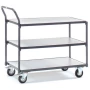 ESD stolna kolica - opterećenja 250 kg poda: - 3 kata - opterećenje srednjeg i gornjeg kata 80 kg. Okvir: - čelična konstrukcija u sivoj boji škriljaca RAL 7015. Gume: - Kotači s gumenim gumama na gumenim čeličnim naplatcima - Okretni kotači s kočnicama. Ležajevi kotača: - Glavčina s valjkovim ležajevima - DIN 68765 - EN 1757-3.