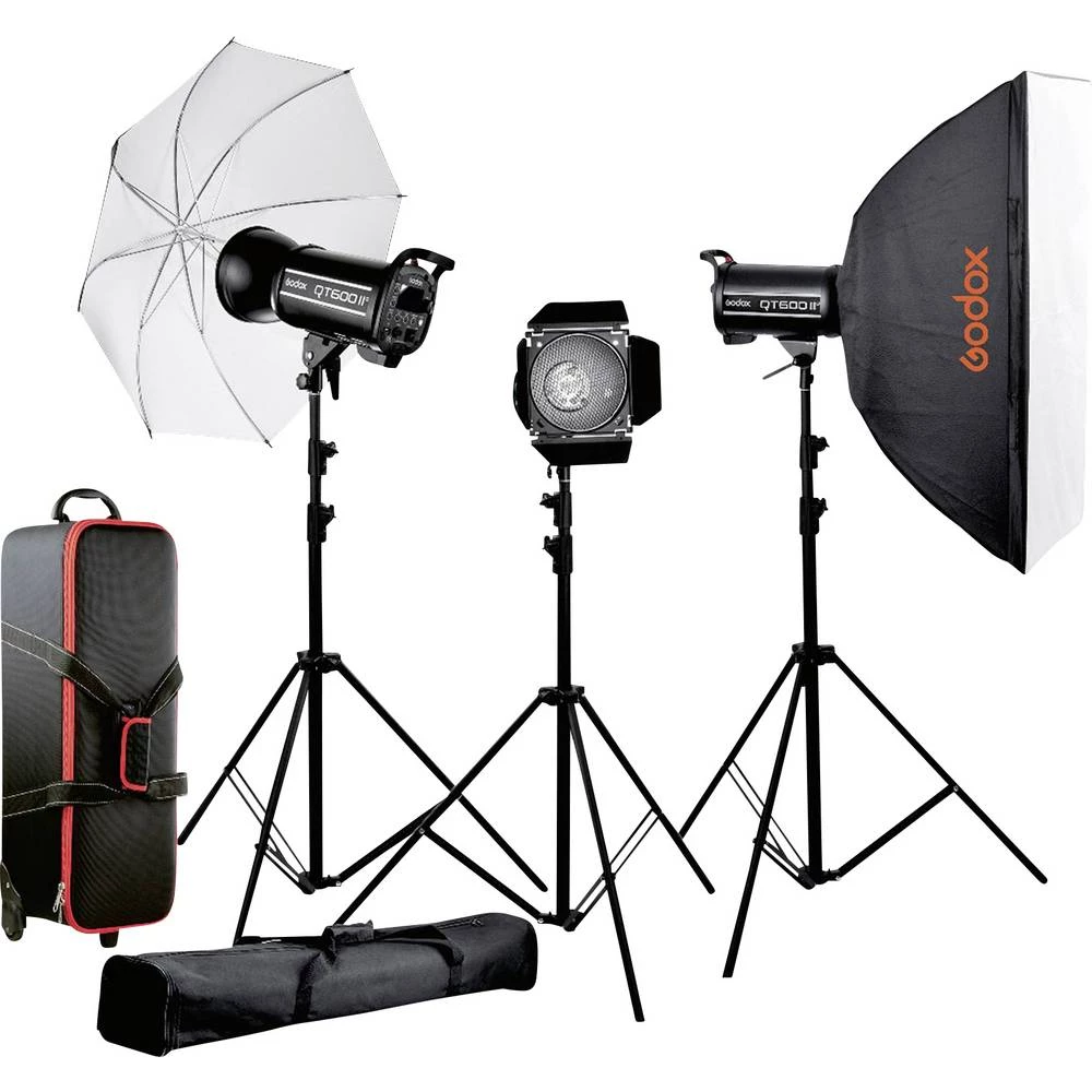 Komplet se sastoji od: 2x studijske bljeskalice QT400II-C, 2x stalka za osvjetljenje 260T, 1x softbox s Bowensovim adapterom SB-FW80120, 1x studijski kišobran crno-bijeli Ø101cm UB-004, 1x komplet vrata za staje BD-04, 1x standardni reflektor, 1x odašiljač XT -16, 1x kofer CB-06, 1x kofer CB-03 za stative Značajke bljeskalice: -Maks. Snaga bljeskalice: 400 Ws-Snaga svjetla za modeliranje: 150 W -temperatura boje: 5600 K (± 200 K) -vodni broj: 65-vrijeme punjenja: 0,05-0,7 sekundi Osobine stalka za svjetlo: -broj segmenata: 3 - Materijal: aluminij - Visina: 100 - 260 cm - Težina: 2 kg Svojstva softboxa: - Priključak: Bowens - Dimenzija: 80 x 120 cm Svojstva kišobrana u studiju: - Boja: crno / bijelo - Promjer: 101 cm Svojstva vrata štale: - Četiri pojedinačno podesive zaklopke - S četiri filtra u boji: žuta, plava, crvena i zelena - svojstva saća / mreže predajnika: - bežični 2,4 GHz sustav - domet: 100 m - kanali: 16 - LC zaslon