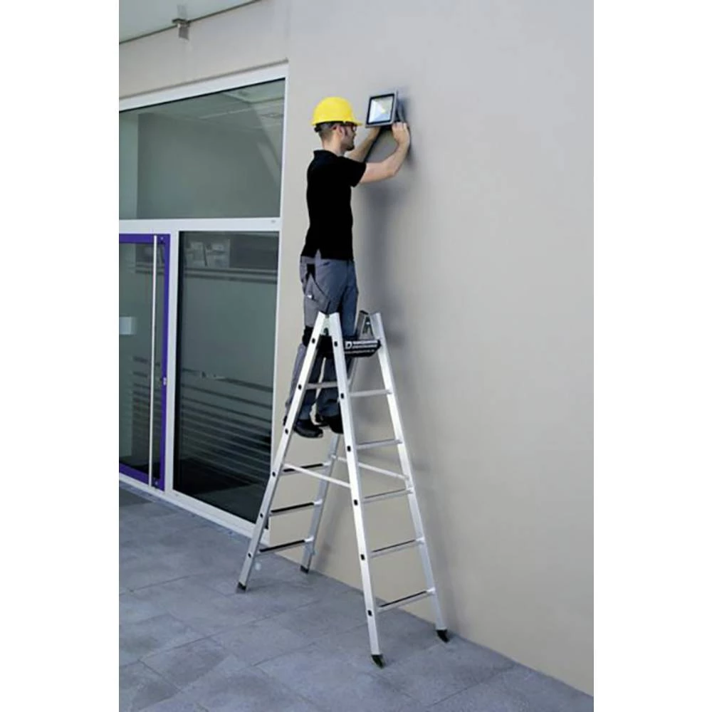 Stubišne ljestve izrađene od aluminija Stabilne pravokutne cijevi obrubljene kvadratnim prečkama 30 x 30 mm s obje strane Četverostruka spojnica s prirubnicom / stilom Konusne vodilice za sigurno držanje Čvrste pocinčane čelične šarke s vijčanim spojem nivello® cipele s ljestvama s patentiranom dvoosnom tehnologijom nagiba Plastične završne kape na Gornji kraj zaštite od širenja lopatice s dvije najlonske trake visoke čvrstoće. Trake za osiguravanje transporta. Udaljenost između prečki: 280 mm