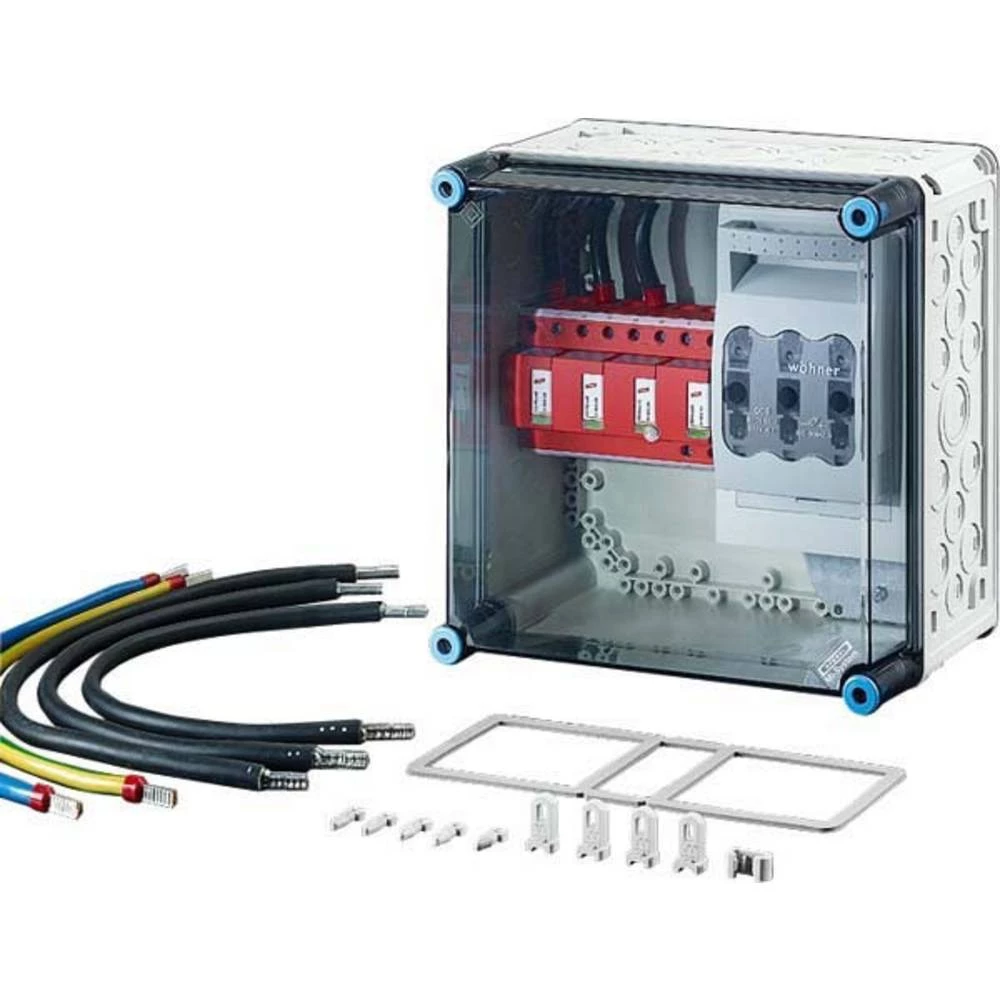 Funkcionalno kućište kao kućište za zaštitu od prenaponske struje s 1 x odvodnikom prenaponske struje tipa 1 i rastavljačem prekidača osigurača NH 00. Brave poklopca za rad alata.