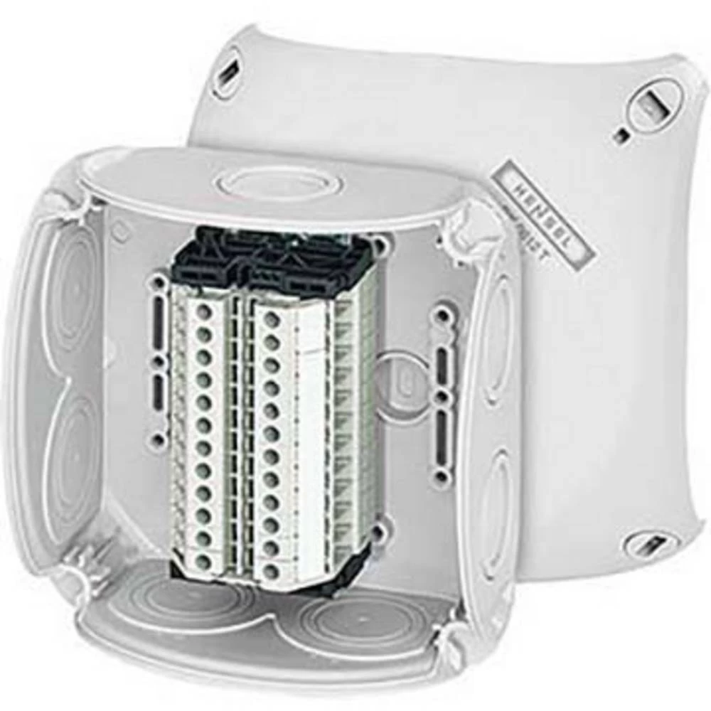 Razvodna kutija izrađena od visokokvalitetne termoplastike s priključnim blokovima za aluminijske i bakrene vodiče. Za površinsku primjenu u zgradama ili zaštićenu ugradnju na otvorenom. S vanjskim trakama za pričvršćivanje i pričvršćivanjem poklopca pomoću brzootvarajućih zatvarača. S remenom na poklopcu. S 12 priključnih blokova do 4 mm². Ulaz kabela putem elastičnih brtvenih membrana na zidovima i dnu kućišta. Naknadna uporaba kabelskih uvodnica moguća je uklanjanjem brtvene membrane.
