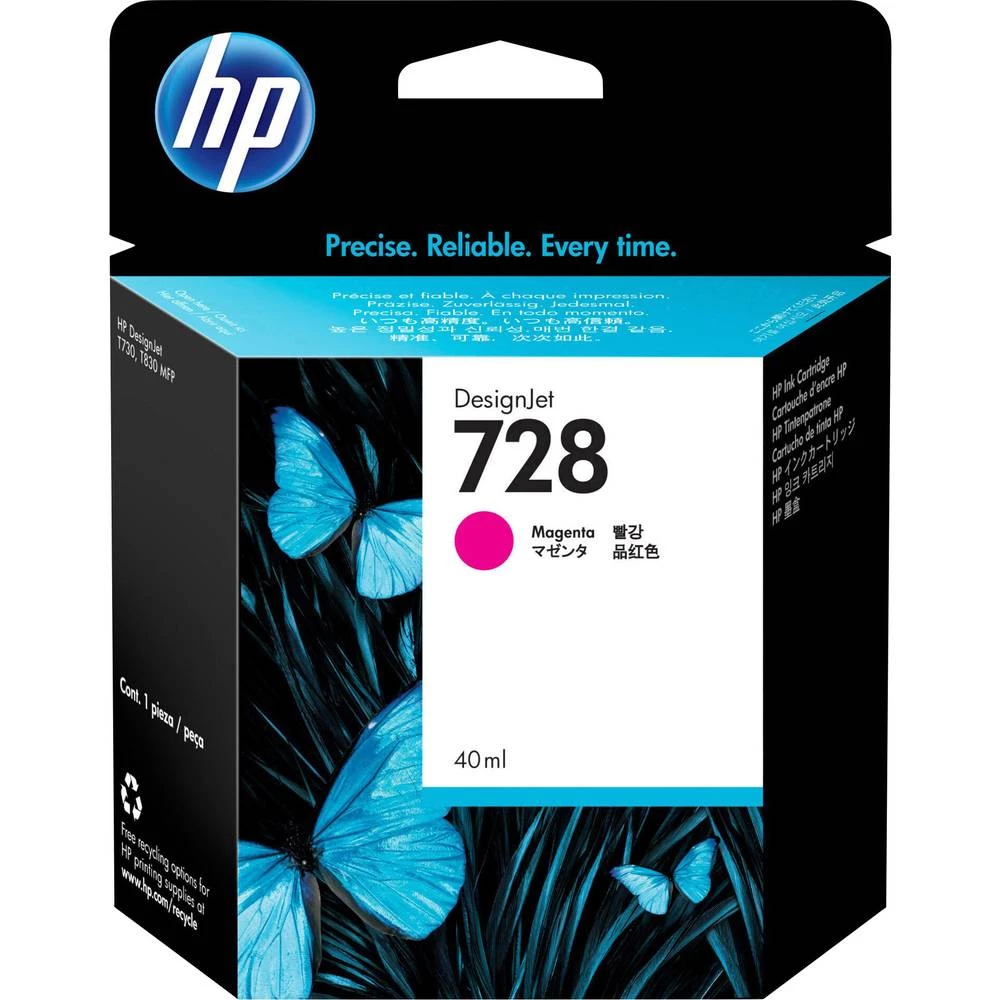 HP 728. Tip: Izvorni, Tip tinte: Tinta na bazi pigmenta, Boje ispisa: Magenta. Širina: 125 mm, dubina: 141 mm, visina: 39 mm