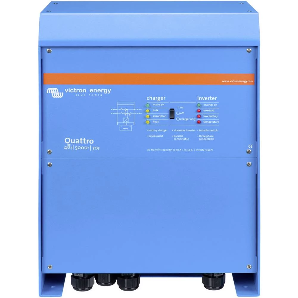 Tri jedinice mogu se uključiti u trofaznoj konfiguraciji. Ali to nije sve: spajanjem šest takvih sustava paralelno, dobiva se 144kW / 180kVA inverter ili 2500A struja punjenja. PowerControl - rad s ograničenom snagom generatora, ograničenom snagom obale ili mrežnom strujom Quattro je vrlo moćan punjač baterija. Zbog toga je potrebno mnogo energije iz generatora ili obalne mreže (16 A po 5 kVA Quattro pri 230 VAC). Na svakom od AC ulaza može se postaviti granica struje. Quattro tada uzima u obzir ostale priključene AC potrošače i koristi za punjenje samo onu energiju koja je još uvijek "lijeva". Time se sprječava preopterećenje generatora ili mrežnog priključka.