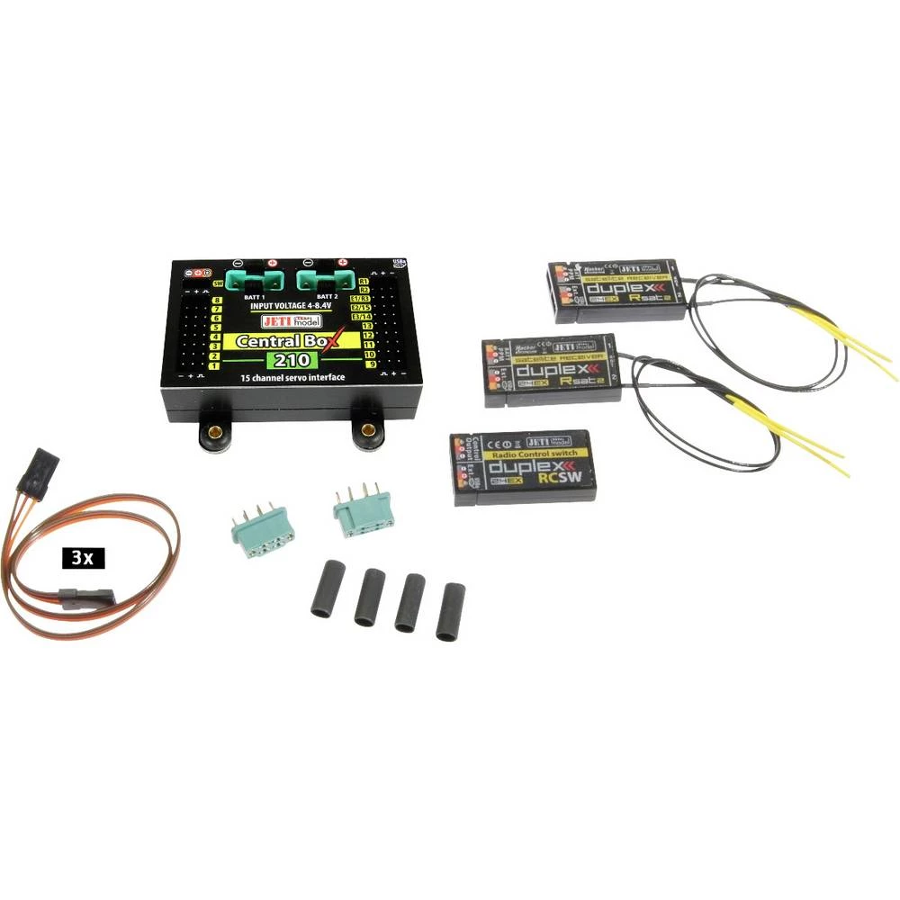 - JETI Duplex 2.4EX Central Box 210 · RC prekidač · 2 JETI Duplex 2.4EX RSat2 prijemnika · 3 patch kabela · Upute