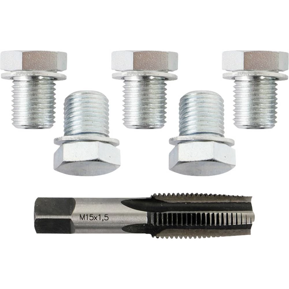 Za brzi i trajni popravak iscrpljenog navoja M14x1,5 na čepu za ispuštanje ulja. Neispravni navoj zamjenjuje se sljedećom većom dimenzijom. Nova veličina navoja M15 za čep za odvod ulja ima duži navoj za aluminijsko korito za ulje.
