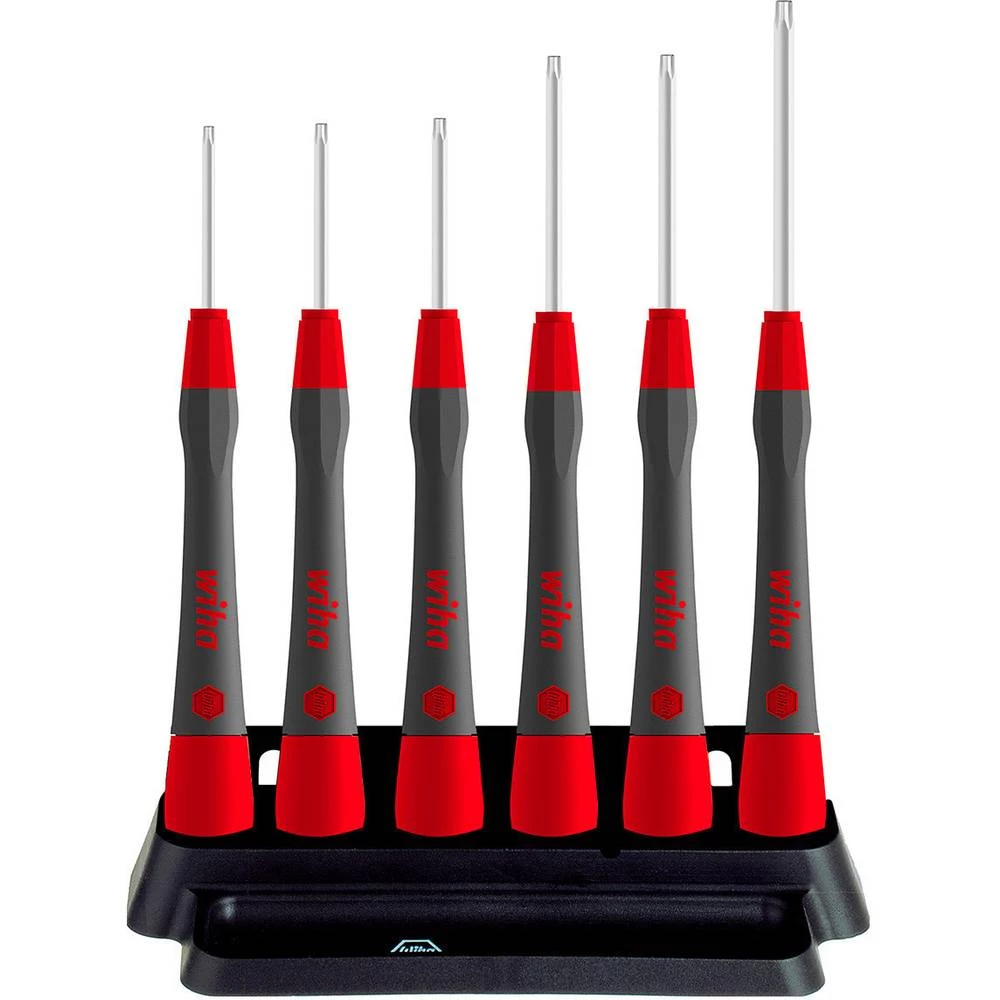 Pojednostavljuje vaš rad: s praktičnim plastičnim držačem za vješanje ili postavljanje. Olakšava rukovanje: iznimno duga rotirajuća kapica omogućuje optimalno vođenje. Štedi vrijeme: Wiha MagicSpring® drži sve vijke Torx® bez magneta. Povećava vašu učinkovitost: koncept gripiranja odvijača za optimalnu ravnotežu između preciznosti i kontrole. Povećava vašu preciznost: osjetljiv radni i kontrolirani prijenos snage zahvaljujući tankom zahvatu s mekanim zonama. Izazov s preciznim mehaničkim spojnicama je da rade precizno i osjetljivo bez oštećenja obratka. Precizni odvijači PicoFinish® Wiha zahvaljujući svojim dugim, tankim ručkama i zoni za brzo okretanje idealni su za fini i filigranski rad u preciznoj mehanici iu sektoru hobija i modela. Ergonomski dizajn ručke s mekanom zonom omogućuje udoban rad. Emocionalno i brzo okretanje podupire glatka okretna kapa. Nadalje, otisnuti simboli odvijača na okretnoj kapici olakšavaju odabir ispravnog profila odvijača. Komplet uključuje 6 preciznih odvijača PicoFinish® i držač. S ovim posljednjim, fini odvijači mogu biti pravilno pohranjeni na radnom mjestu. Primjena: Idealan za fino i filigransko zavrtanje u preciznoj mehanici, izradi modela i hobiju. 1 x Precizni odvijač PicoFinish® TORX® MagicSpring® (42501) T6 x 40 mm 1 x Precizni odvijač PicoFinish® TORX® MagicSpring® (42502) T7 x 40 mm 1 x Precizni odvijač PicoFinish® TORX® MagicSpring® (42503) T8 x 40 mm Precizni odvijač PicoFinish® TORX® MagicSpring® (42504) T9 1 x precizan odvijač PicoFinish® TORX® MagicSpring® (42505) T10 1 x precizan odvijač PicoFinish® TORX® MagicSpring® (42506) T15 x 60 mm