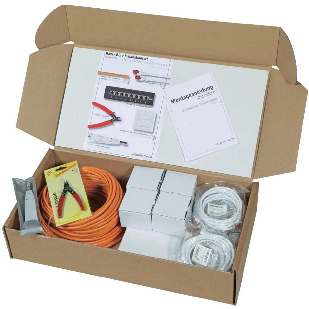 Strukturirano kabliranje je osnova za umrežavanje zgrada koje su orijentirane na budućnost, ovisno o primjeni. Ovaj instalacijski set sadrži sve bitne komponente potrebne za postavljanje zaštićene kućne / uredske mreže. Komponente se međusobno optimalno usklađuju, udovoljavaju Cat.6 standardu i tako jamče radne frekvencije do 250 MHz. Instalacijski kompleti zaokruženi su LSA + alatom za umetanje i rezačem kabela.