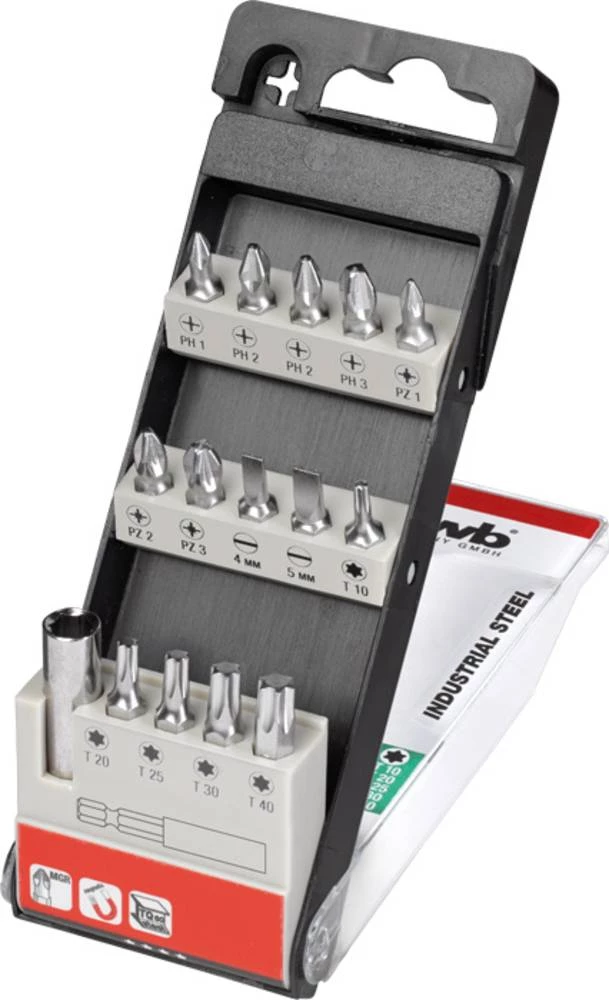 16-dijelna KWB KOMBI kutija sadrži 15 standardnih bitova izrađenih od TQ 60 čelika i magnetskog držača bitova za akumulatorske odvijače. Čelik TQ 60 odlikuje se svojom tvrdoćom u kombinaciji s fleksibilnošću. To čini bitove vrlo izdržljivima čak i pod velikim pritiskom. Rebra na vrhu bita osiguravaju bolje prianjanje i sprječavaju klizanje s vijka. Bitovi su jasno raspoređeni u praktičnoj preklopnoj kazeti s funkcijom pozicioniranja za praktično uklanjanje.