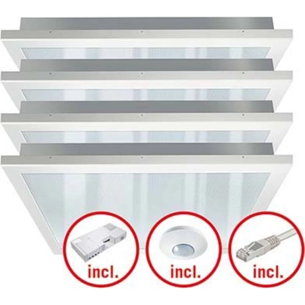 LED svjetlosni set (4x pojedinačna svjetla, kontrola, detektor prisutnosti i SFTP kabel s RJ45 priključkom) s prizmatičnim (CRYSTAL) poklopcem (difuzor). Može se koristiti kao ugradna stropna rasvjeta za stropne sustave sa skrivenim ili vidljivim montažnim tračnicama za dimenzije sustava 600x600mm (Molimo obratite pozornost na posebne značajke i moguća ograničenja proizvođača stropnih sustava!). Vrlo dobra kvaliteta svjetla, VDU radna stanica prema EN 12464-1 i tehnički crtež. Životni LED L70 / B50 = 100.000 h, L80 / B50 = 65.000 h, L90 / B50 = 30.000 h, L80 / B10 = 50.000 h. Kontrola svjetla i scene lako se konfigurira putem ESYLUX univerzalnog daljinskog upravljača. Temperatura boje približno 4000 K (neutralna bijela).