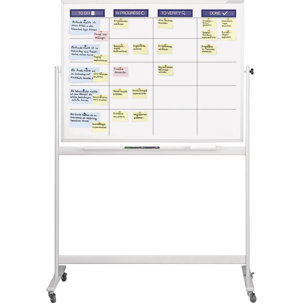 set za planiranje magnetoplanom SCRUM XL mobile, veličina ploče: 1800 x 1200 mm. Složen tijek rada, za timove do 9 članova. Set optimalno podržava procese samoorganiziranja i planiranja agilnih projektnih timova prilikom primjene postupnog (iterativnog) modela procesa prema Scrumu. Izraz scrum izvorno je posuđen iz ragbija. Opisuje okvir sastavljen od samo nekoliko pravila u kojima se i softverski i drugi razvojni projekti mogu učinkovitije i uspješnije provoditi. Dobro promišljeni sastav SCRUM-ovog seta za planiranje timovima pruža svu osnovnu opremu. Možete odmah početi raditi s Scrum pločom. Magnetska + zapisljiva ploča uključena u set čini idealnu osnovu za agilno planiranje prema Scrumu. Ukratko prednosti Scrum ploče: Vizualizacija cjelokupnog tijeka rada u obliku pojedinačnih koraka rada · Može se individualno prilagoditi posebnim zahtjevima trenutnog projekta. Korištenje magnetskih + djelomično višekratnih materijala optimalno podržava okretnost u procesu planiranja. Zastupljenost korisničkih priča, zadataka u tijeku rada i njihovih odgovornosti omogućuje svima uključenima da u svakom trenutku vide napredak trenutnih radnih procesa (iteracija / sprint). Fizička blizina i izravna komunikacija članova tima u Scrum odboru promiče učinkovitu interakciju i zabavu u timskom radu. Za izravnu uporabu preporučujemo komplete magnetoplan Scrum Board. Isporuka uključuje bijelu ploču (za zidnu ili mobilnu montažu) i pripadajući pribor. Standardni sadržaj sadržaja: 10 x magnetofix magnetski okviri TOPSIGN u plavoj boji (A5 pejzaž / A4 portret). 3 x samoljepljiva traka, 2,4 mm. Po 250 komunikacijskih kartica, pravokutne, žute, ružičaste, plave. 4 x markera za ploču i flipchart PRO +, poredanih po boji. 56 x žuti držač dopisa. 8 x držač bilješki plavi - 4 kom. 1 x sredstvo za čišćenje dasaka (250 ml). 1 x gumica za tablu PRO +, magnetska. 1 x škare za papir. Pogodno za timove do 9 članova - složen tijek rada. Preporučeni stupci: 4 - 6. Minimalna širina stupa: 30 cm. Preporučene trake priča: do 9. Preporučena visina ploče: 15 cm.