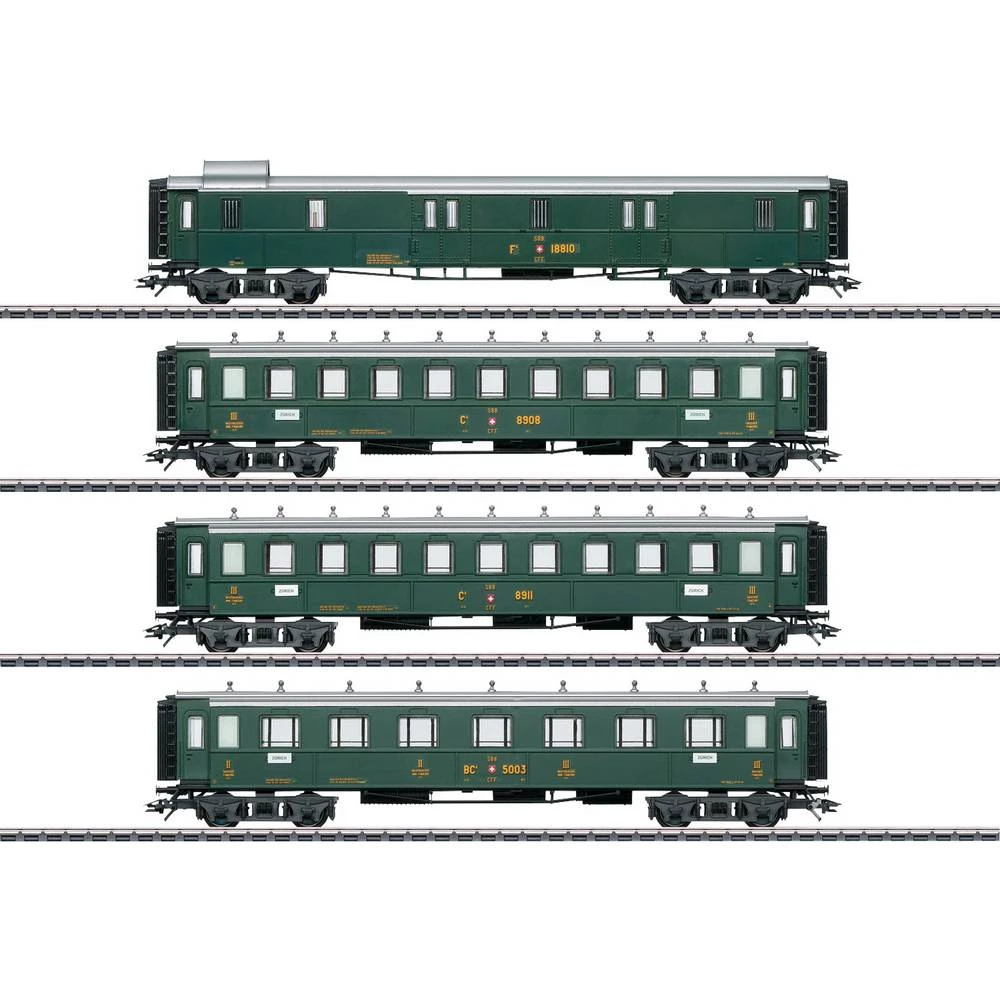 Stariji dizajn švicarskih saveznih željeznica (SBB / CFF / FFS) u jelko zelenoj osnovnoj shemi boja. 1 F4 automobil s prtljagom. 2 osobna automobila C4, 3 Klasa. 1 BC4, 2. i 3. putnički automobil Klasa. Izvorno radno stanje.