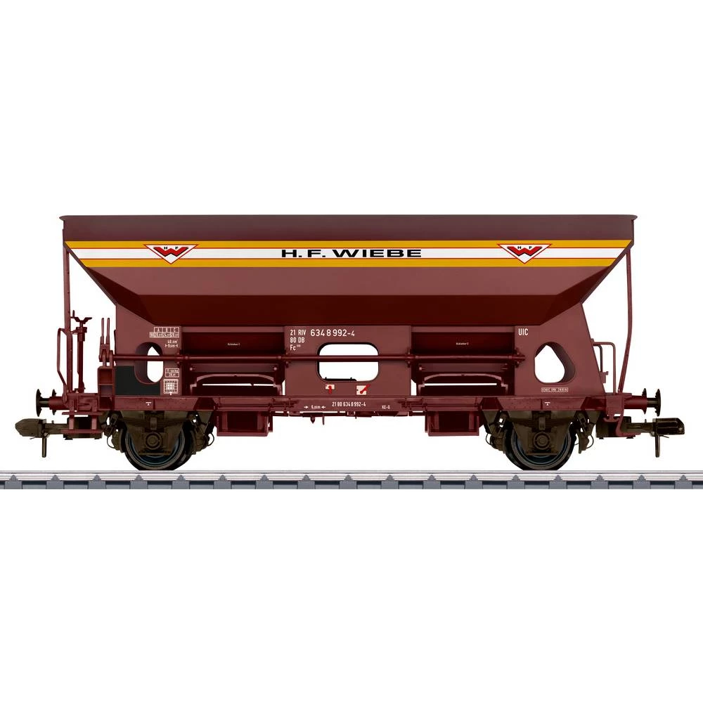 Prototip: Deutsche Bahn AG (DB AG) tip Fc 098 bočni istovarni automobil sa reklamnim natpisom za građevinsku tvrtku HFWiebe. Broj automobila 21 80 634 8 992-4. Upotrijebite, na primjer, kao vagon za prigušenje.