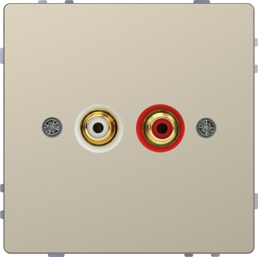 S dvije RCA utičnice. Boje: crvena i bijela. Pozlaćeni kontakti. Kontakti s priključcima za lemljenje. Materijal: termoplastični lak. Boja: Sahara.