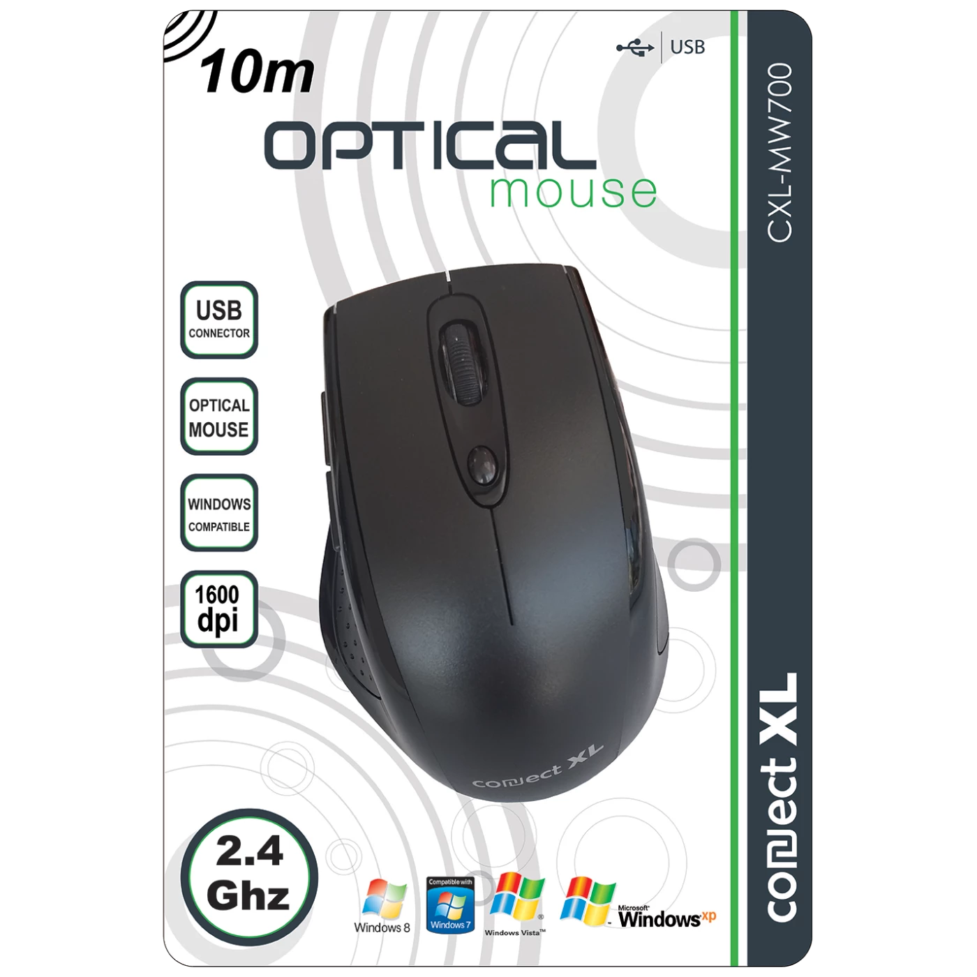 Bežični optički miš 2.4GHz, 800/1600dpi, domet 5-10 metara, 5 tipki, skrol, konekcija USB Nano, crna boja.