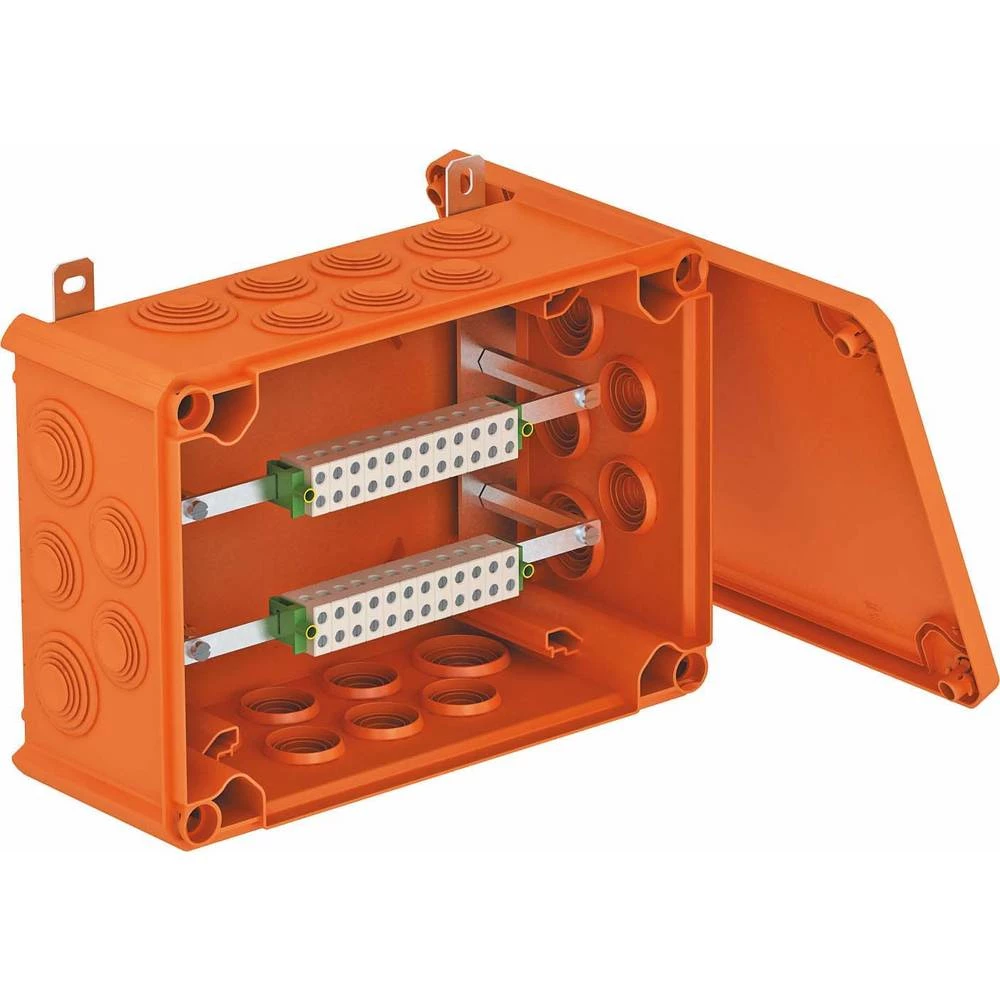 Razvodna kutija bez halogena kao mali razdjelnik s predfabriciranim, mekanim utikačem, odobren za održavanje električne funkcije u skladu s DIN 4102 dio 12. Razredi održavanja funkcija E30 do E90. Kompletno sastavljena priključna jedinica izrađena od posebnih keramike otpornih na visoke temperature i označenih zaštitnih stezaljki vodiča. Isporučuje se s 4 vatrootporna sidra za vijke MMS 6x50 za pričvršćivanje na vanjske trake bez klinova. Moguće je do 6 krutih bakrenih žica (0,5 mm²) po terminalu. Razvodna kutija ima klasu otpornosti na udar IK06. Pojedinosti o tipovima kabela i proizvođačima mogu se naći u općoj potvrdi o ispitivanju građevinske inspekcije MPA NRW, Erwitte.