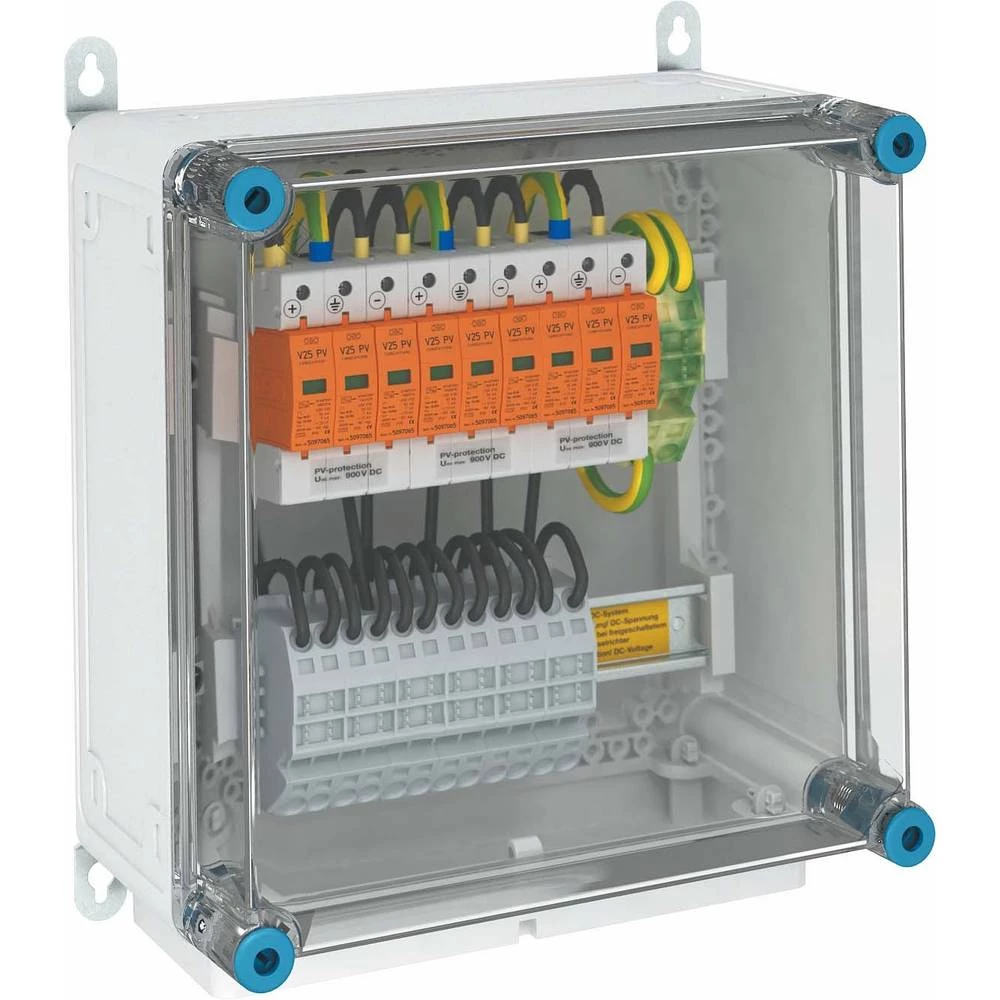Sistemsko rješenje za strujnu i prenaponsku zaštitu fotonaponskih pretvarača s 3 zasebna ulaza (MPP tracker) koji su unaprijed montirani za priključenje u kućište. Odvodnici s Y-vezom otpornom na greške s 3 varistora za uporabu u skladu s VDE 0100-712, priključni s uređajem za dinamičko razdvajanje i optičkim funkcijskim prikazom karakterizirani su niskom razinom DC zaštite<3,0 kV isključeno. Kućište s kabelskim uvodnikom, s IP65 zaštitom, izrađeno od polikarbonata, otporno je na UV zračenje i prikladno za vanjsku uporabu. Šest stezaljki do 6 mm² već su unaprijed instalirane po zaštitnom uređaju. Jednostavno, brzo i sigurno priključivanje istosmjernih kabela preko priključnih blokova omogućuje optimalnu zaštitu od električnog pretvarača. Zaštitni uređaji moraju biti odabrani prema maksimalnom zbroju napona praznog hoda (Uoc) PV niza. Ako postoji opasnost od kondenzacije zbog vjetra, leda, temperature ili sunca, možda će biti potrebne dodatne mjere!