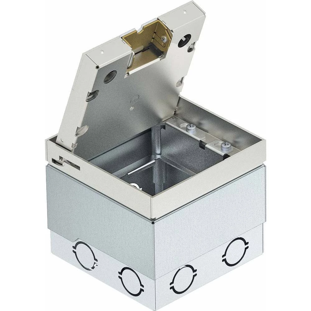 Kvadratna instalacijska jedinica za uporabu u suhim očišćenim podovima i podovima. Ugradno kućište s prethodno utaknutim ulaznim otvorima za cijevi (M25). Gornji dio se može podešavati pomoću četiri nosača za poravnavanje na gornjem rubu podne obloge. Minimalna dubina instalacije je 110 mm, izravnavajuća površina + 20 mm. Mogu se instalirati do dva Modul45 priključka. Osim toga, mogu se instalirati dva modularna podatkovna modula (Keystones) s opcionalnim nosačima za montažu. Površine vidljive u podnoj oblozi izrađene od nehrđajućeg čelika, brušene.