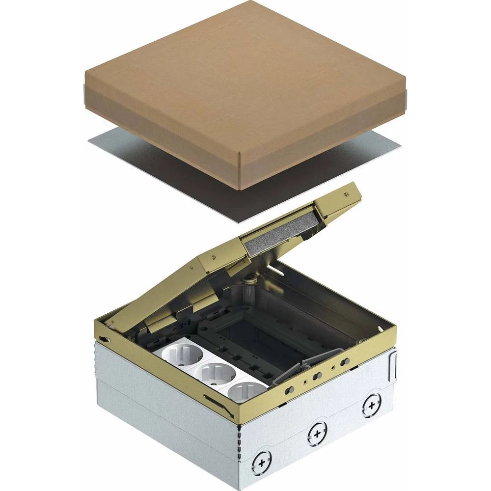 | Dodatne tehničke informacije | Poklopac verzije = kvadrat<br>Prikladno za mokru njegu = br<br>Prikladno za podni kanal = br<br>Prikladno za ugradnju u šuplje podove = da<br>Prikladno za instalaciju s dvostrukim podom = br<br>Broj čaša uređaja = 2<br>= Mesinga materijala<br>S udubljenjem podne obloge = da<br>Dubina udubljenja podne obloge = 15 mm<br>Pod pokriva okvir za zaštitu ne-<br>Minimalna dubina ugradnje = 95 mm<br>Širina vanjske dimenzije = 205 mm<br>Širina ugradnje = 205 mm |