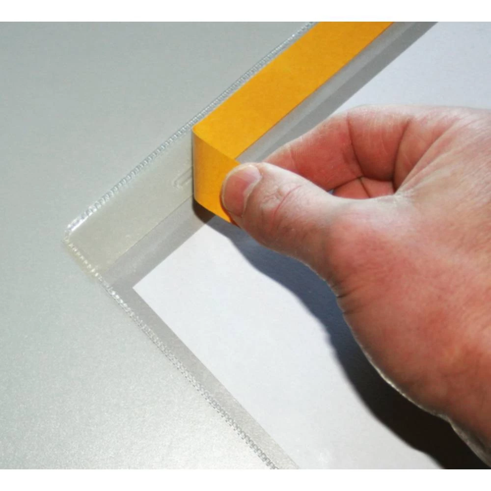 Poklopac za dokumente, DIN A5 u portretnom formatu, visina x širina 215 x 160 mm, stražnji samoljepljiv, ekstra robustan sa zavarenim rubovima, u prozirnom stanju.