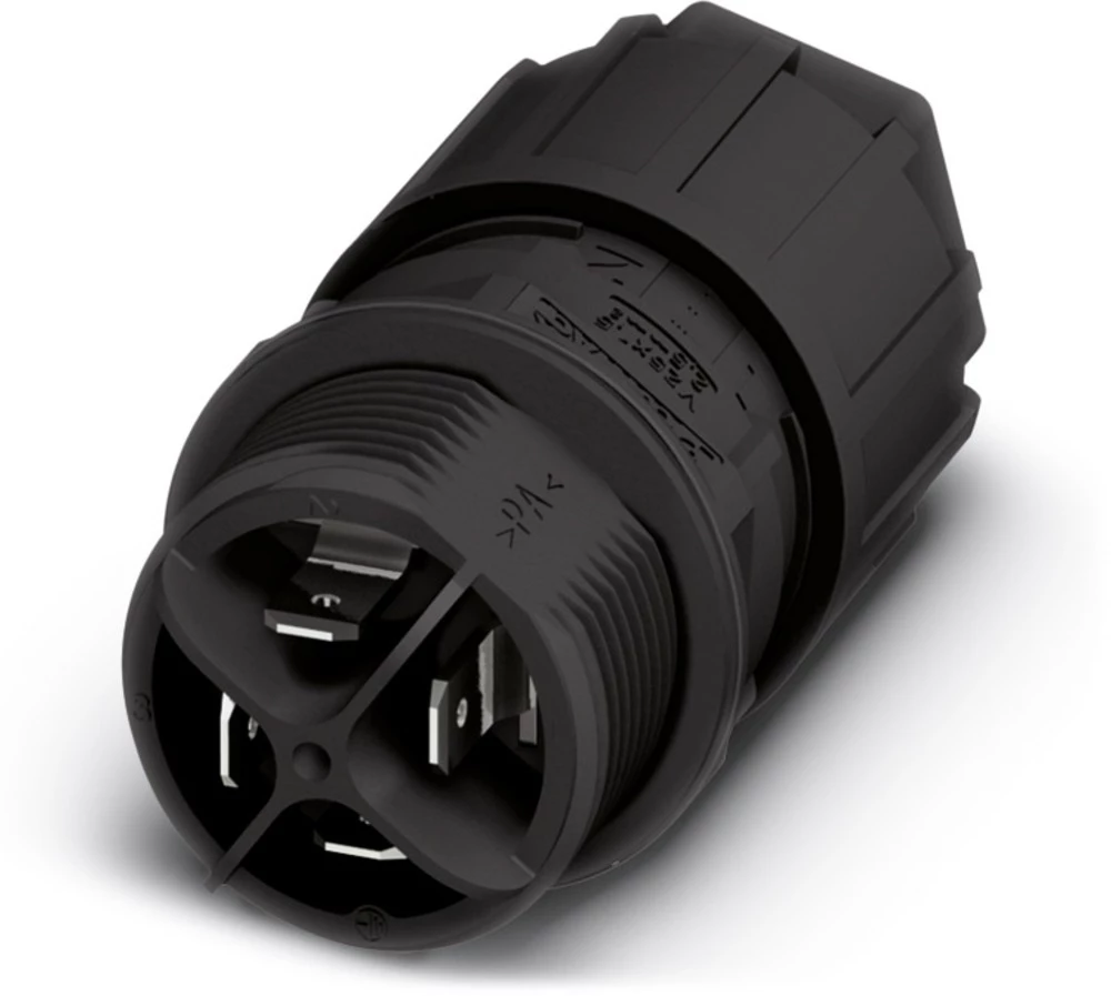 QUICKON-wall bushing, black, 3+ PE pos., 1.0 mm² ... 2.5 mm² / 630 V / 20 A, with QUICKON nut, for cable diameter of 6 mm.... 10 mm, with 4 spade connectors for spade receptacles as per DIN 46247-2
