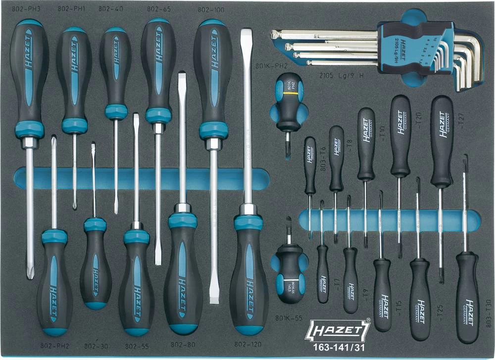 Komplet odvijača Pogodno za HAZET Assistant 173, 179, 179 W, 179 BIG-1, 179 XL, 179 XXL, 179 A XXL, 179 T XXL i 180 s dubinom ladice od 398 mm· Sustav sigurnosnih umetaka - Svi alati koji su otporni na vibracije - Nedostaje alat odmah. · Mogućnost čišćenja uložaka (isperite pod tekućom vodom, pustite da se osuši - učinite!). · Odgovara svim pomoćnim mehanizmima za kolica HAZET s ladicama. Kod pomoćnih kolica alata 173, 179 i 180 također preporučujemo plastične umetke 173-36 / 5 ili umeće od meke pjene 163-522x40 ili 163-522x50. · Set od 31 komada,. · U sustavu sigurnosnog umetka, 2-komponentni mekani pjenasti umetak 3/3 + (519 x 392 mm). · Sadržaj:. 802-30 40 55 65 80 100 120. 802-PH 1 PH 2 PH 3. 801 K-55 801 K-PH 2. 803-T 6 T 7 T 8 T 9 T 10 T 15 T 20 T 25 T 27 T 30. 2105 Lg-015 02 025 03 04 05 06 08 10.