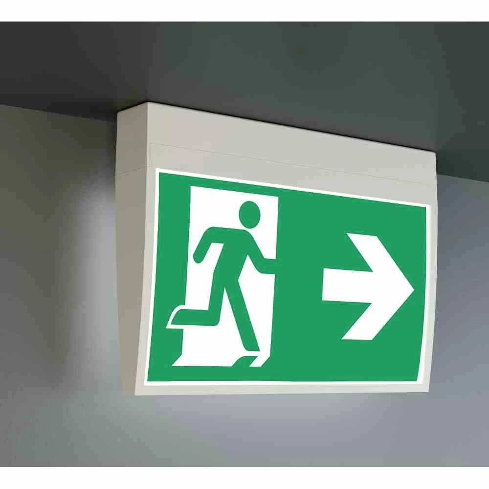 Tanka, konveksna plastična svjetiljka za univerzalnu montažu za označavanje izlaza za bijeg i spašavanje za jednostrano ili dvostrano ispisivanje u skladu s DIN EN 60598-1, DIN EN 60598-2-22 i DIN EN 1838. LED tehnologija s bijelim SMD LED diodama velike snage.
