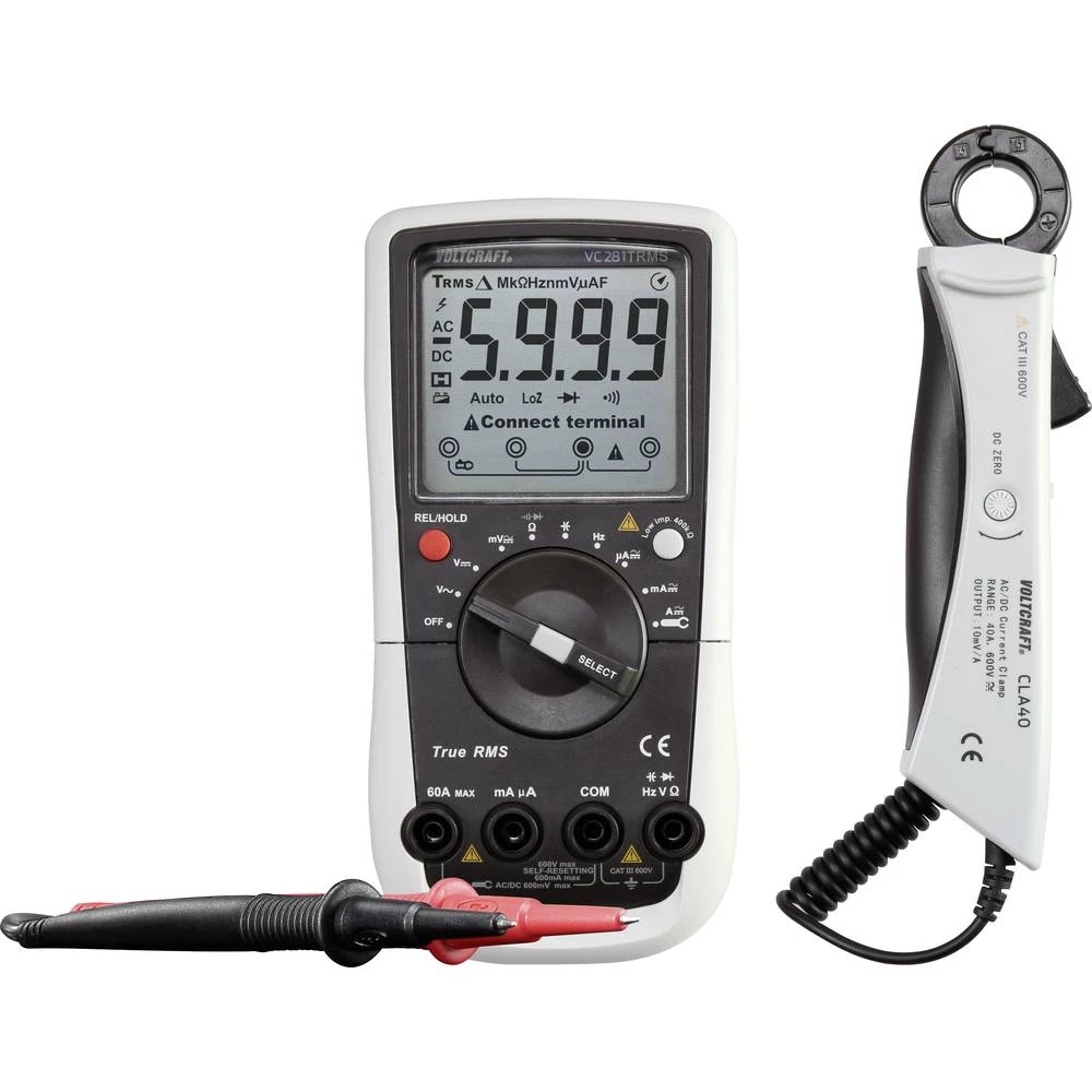 Priloženi adapter za stezanje struje CLA-40 prikladan je za beskontaktno mjerenje izmjeničnih struja do 40 A. Pomoću trofaznih krugova, podjela se može odrediti brzo i pouzdano. Krug se ne mora isključiti tijekom mjerenja. VOLTCRAFT VC-281 pokazuje točno izmjerenu vrijednost u amperima kada je trenutna stezaljka u položaju prekidača, jer se stega i multimetar savršeno podudaraju.