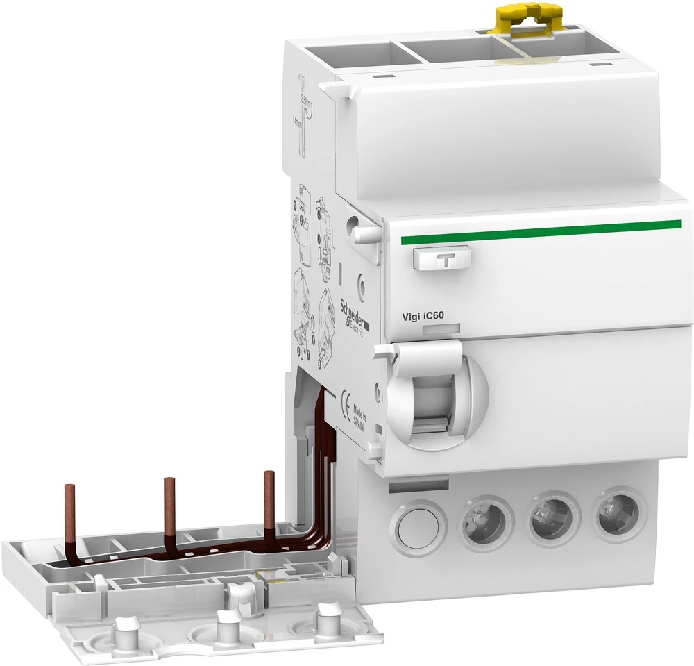 FI blok Vigi iC60L, 3P, 25A, 500mA, tip A. Tip proizvoda ili komponente: dodatni blok uzemljenja - Skraćeni naziv uređaja: Vigi iC60 - Opis polova: 3P - Osjetljivost zemljospoja: 500 mA - vremensko kašnjenje zaštite od zemljospoja: nerazrijeđeno - uzemljenje Klasa zaštite: Klasa A - Vrsta mreže: AC - Mrežna frekvencija: 50/60 Hz - Nazivni radni napon Ue: 400 V AC 50/60 Hz acc. EN 61009-1, 400/415 V AC 50/60 Hz prema IEC 61009-1.