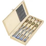 Garnitura dlijeta, 4 komada, kratka, lagana, prema B DIN 5139 sa bočnim kosinama, sa spljoštenom grabovom drškom u drvenoj kutiji. Sastoje se od po 1 komada: dlijeta 10, 16, 20, 26 mm »CHERRY« su ručno kovana od specijalnog alatnog čelika s visokim udjelom ugljika. S tvrdoćom od ± HRc 61 po cijeloj korisnoj duljini oštrice, znatno su iznad DIN standarda i daju glatki rez zahvaljujući svojoj glatkoj, poliranoj površini. Dlijeta se isporučuju iz tvornice s kutom reznog ruba od 25°. Ovaj kut je prikladan za meko do srednje tvrdo drvo. Preporučujemo da oštricu naših dlijeta naoštrite kamenom za oštrenje prije prve uporabe.