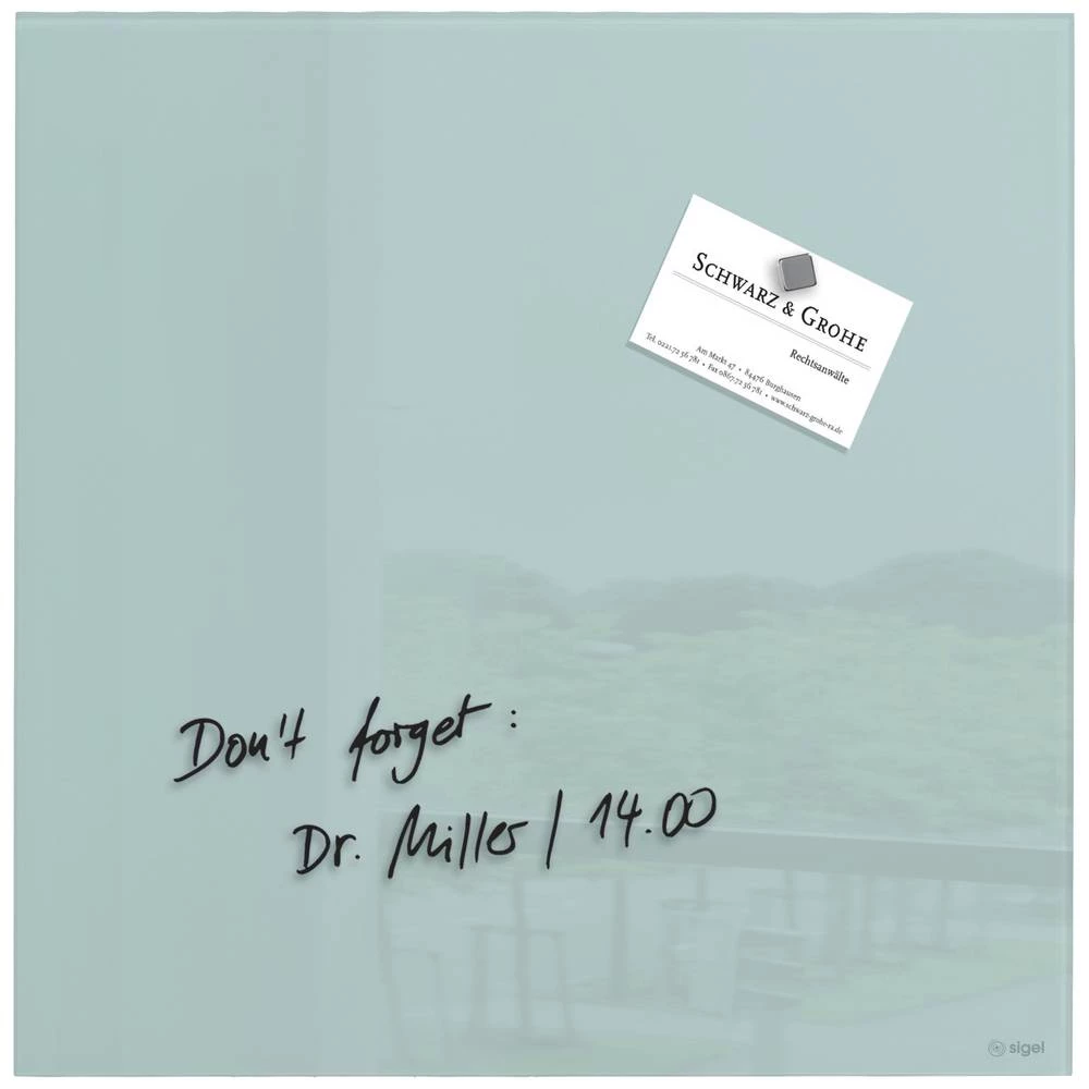 Artverum nije bilo kakva magnetna staklena ploča, već reprezentativan dizajnerski objekt koji će vas inspirirati. Staklena magnetna ploča visokog sjaja iz serije Artverum međunarodno nagrađivane za dizajn u formatu 30 x 30 cm u akvamarinu lako se montira u portretnom ili pejzažnom formatu s priloženim materijalom za pričvršćivanje i može se kombinirati s drugim pločama s istim razmakom od zida od 9 mm. Svojim slobodno lebdećim, čistim izgledom, magnetska staklena ploča bez okvira nudi dovoljno prostora za vaše misli, nacrte i planove. Elegantna, a istovremeno višenamjenska staklena površina može se pisati markerima za staklenu i bijelu ploču, magnetska je pomoću posebno jakih neodimskih magneta i lako se čisti vlažnom ili suhom krpom. Preporučamo SIGEL gumicu za brisanje ploča za brzo kemijsko čišćenje između ili SIGEL sprej za čišćenje ploča i krpu od mikrovlakana za temeljito mokro čišćenje. Pladnjevi i držači serije Clip&Organise idealni su za pohranjivanje pribora.