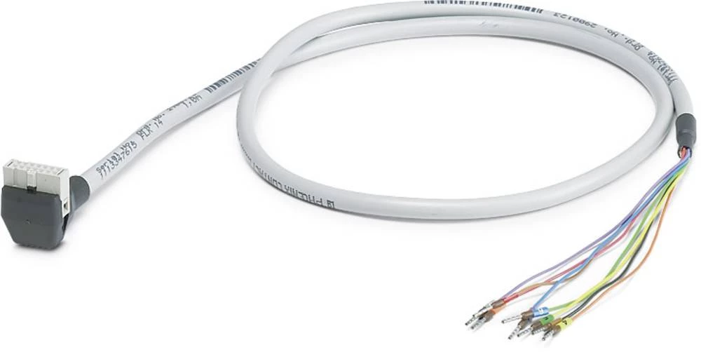 System cable with a 14-pos. molded socket strip (90° outlet) and one open end with 8 wires for connection to Axioline realtime I/O. At the open end, the wires are labeled 1 to 8 and are fitted with ferrules, cable length: 2.5 m.