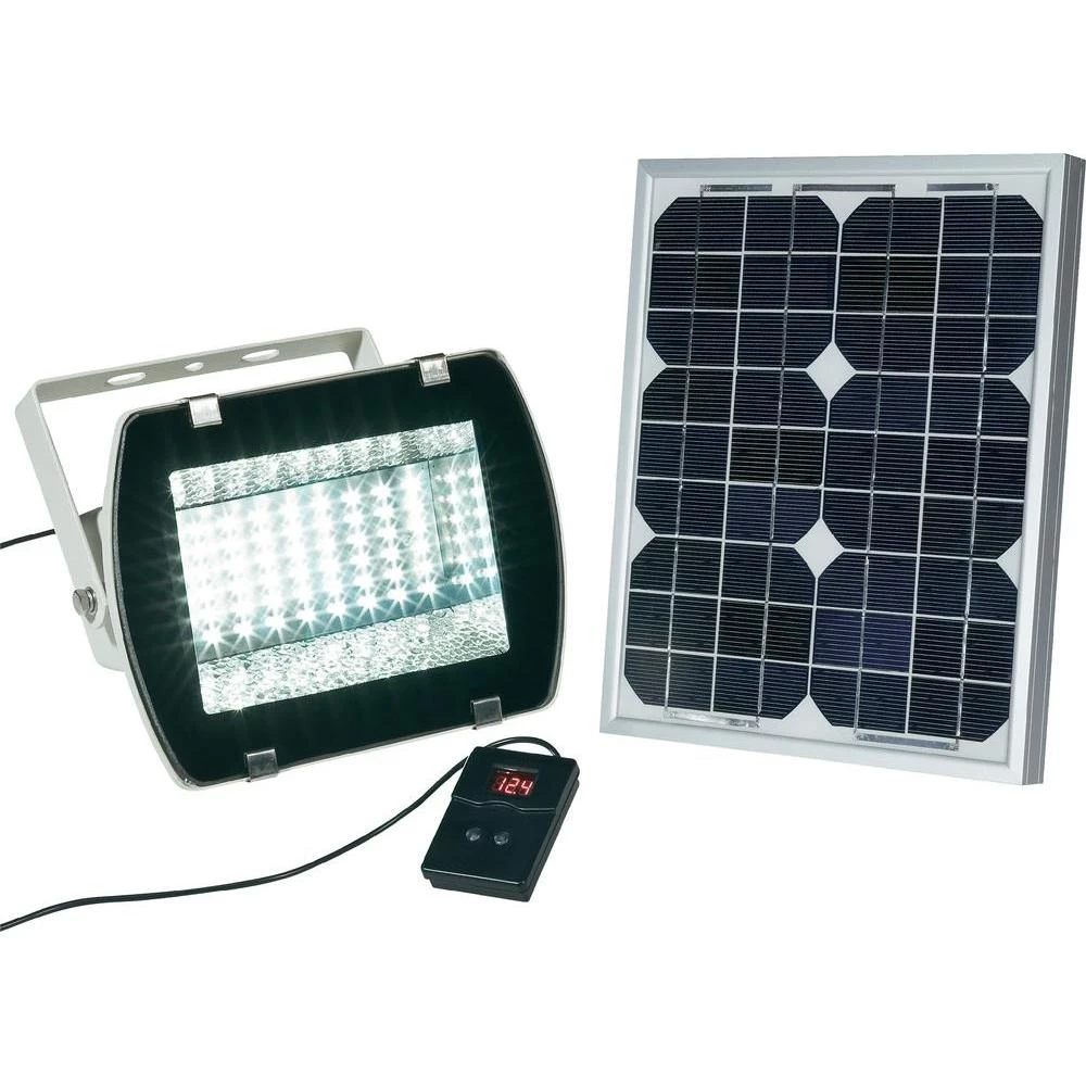 utičnici. Priključite priloženi solarni modul od 10 W na reflektor i integrirani akumulator će se automatski puniti pomoću ugrađene elektronike. Reflektor se automatski uključuje u mraku. Uz