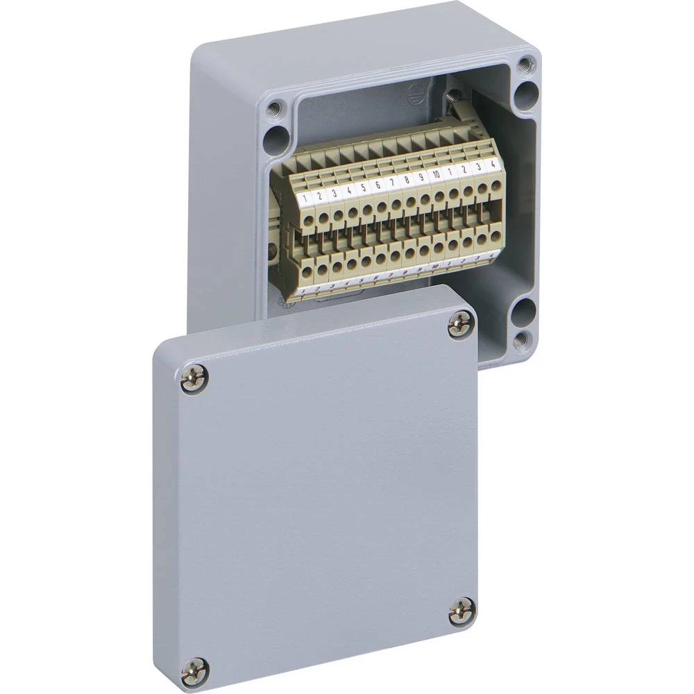 Kućište stezaljke u kompaktnom dizajnu, aluminij industrijske kvalitete, presvučen prahom, srebrno-sivi RAL 7001, opremljen s 14 vijčanih stezaljki 4qmm