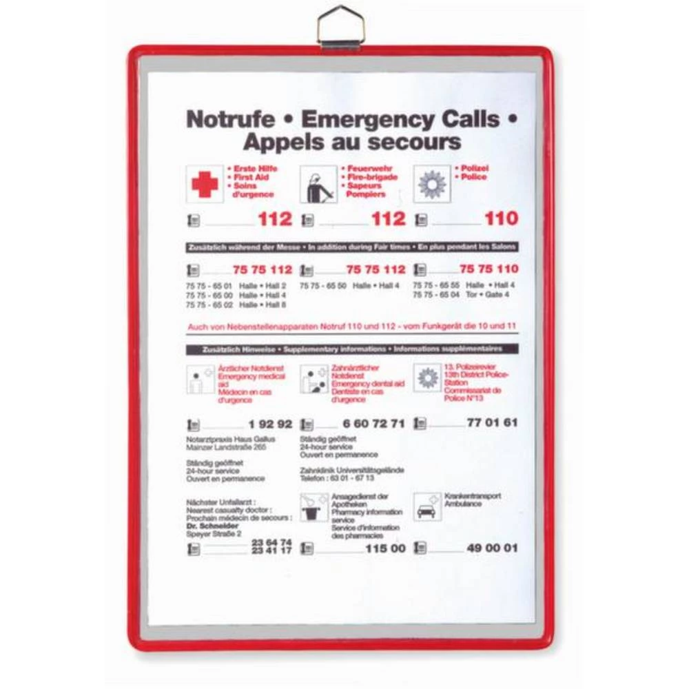 Displej, DIN A3 u portretnom formatu, okvir od čelične žice s plastičnom prevlakom u crvenom, plastična ploča, za pričvršćivanje na zid, okvir s metalnom ušicom.