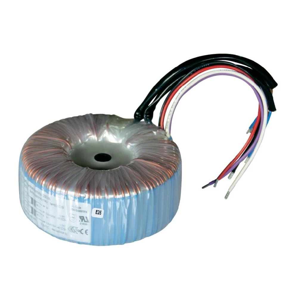 Galvansko odvajanje između primarnog i sekundarnog navoja. Jako malo magnetsko rasipno polje. Transformator s prstenastom jezgrom impregniran na montažnoj ploči s središnjim