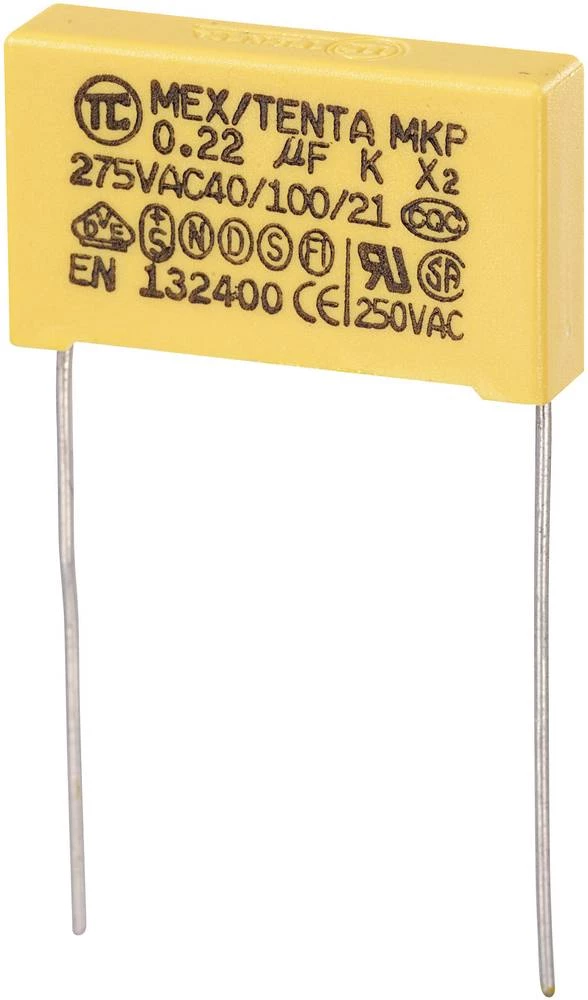 - MKP-X2-Radijski kondenzator za uklanjanje smetnji, radijalno ožičen 0.22 µF 275 V/AC 10 % 22.5 mm (D x Š x V) 26.5 x 7 x 17 mm MKP-X2 1 kos