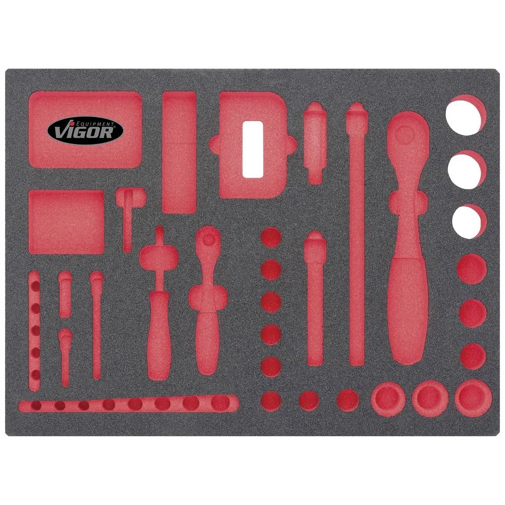 Mekani uložak od pjene, prazni VIGOR 2-komponentni umetci od meke pjene Lako se čiste: čiste pod mlazom vode i suši Nedostajući alati su odmah vidljivi kroz crvenu udubinu Sve je na svom mjestu - savršen red Štiti alate, jer su ugrađeni u ne -slip način Svaki alat ima svoje predefinirano mjesto Otporan na ulja i masti